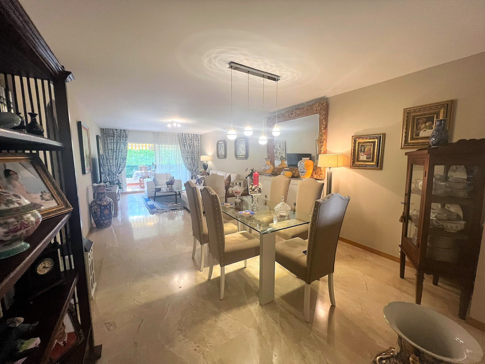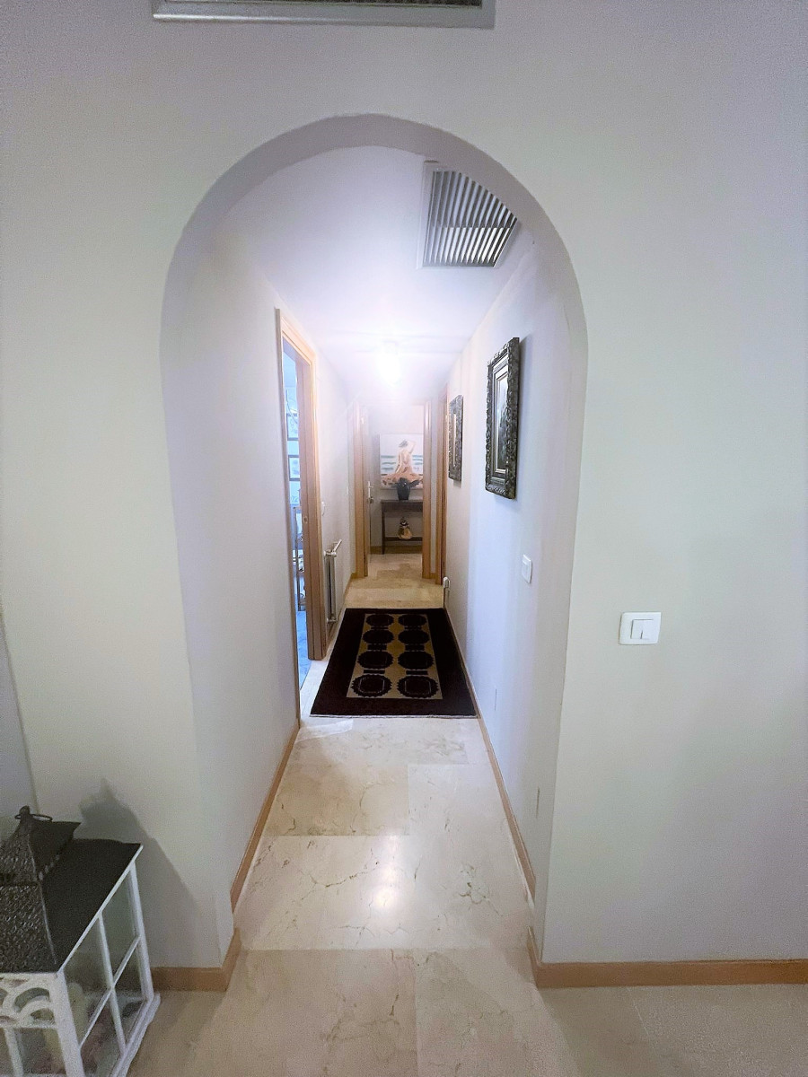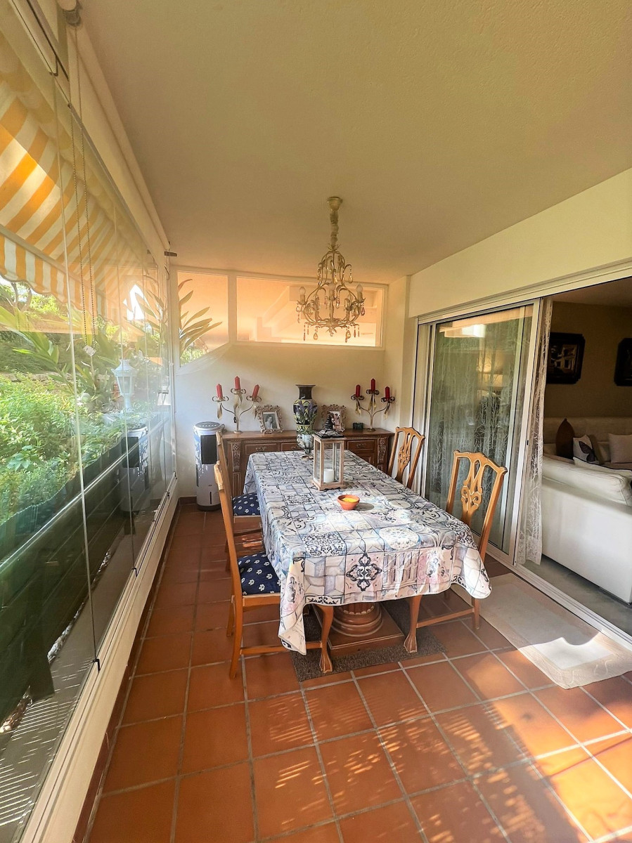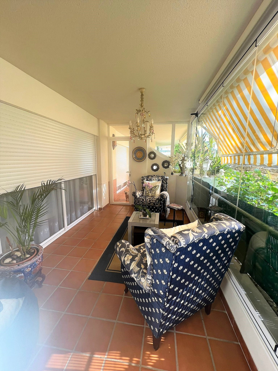 SPECTACULAR GROUND FLOOR FLAT IN URB. GUADALMINA ALTA. It has an entrance hall, living-dining room, fully equipped and independent kitchen, two double bedrooms, the main one en suite, two complete bathrooms with refurbished furniture and sanitary fittings. From the living room and the main bedroom there is access to a spectacular terrace overlooking the garden, possibility to put glass curtains and to have winter and summer terrace. Both bedrooms have large built-in wardrobes and there is the possibility to install glass curtains and to have a winter and summer terrace. Fully fitted kitchen with all electrical appliances. Marble floors, wooden doors. Centralised hot/cold air conditioning. Garage space (large car) and storage room included in the price. The property is located in one of the best urbanisations in Guadalmina Alta, next to the Barcelo hotel. Gated urbanisation with concierge and maintenance service. 7 communal POOLS and children's play area. Surrounded by the best golf courses on the Costa del Sol. A few minutes to San Pedro de Alcántara town, 5 minutes to the Guadalmina Commercial Centre which has all the services, supermarkets, pharmacies and renowned restaurants. Very close to the Paseo Maritimo, only 5 km from Puerto Banus.