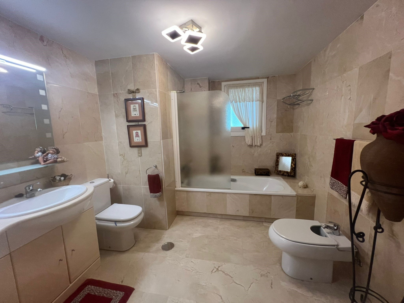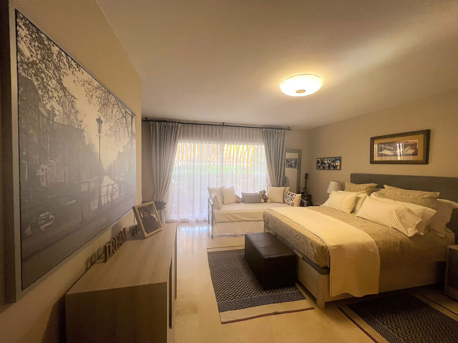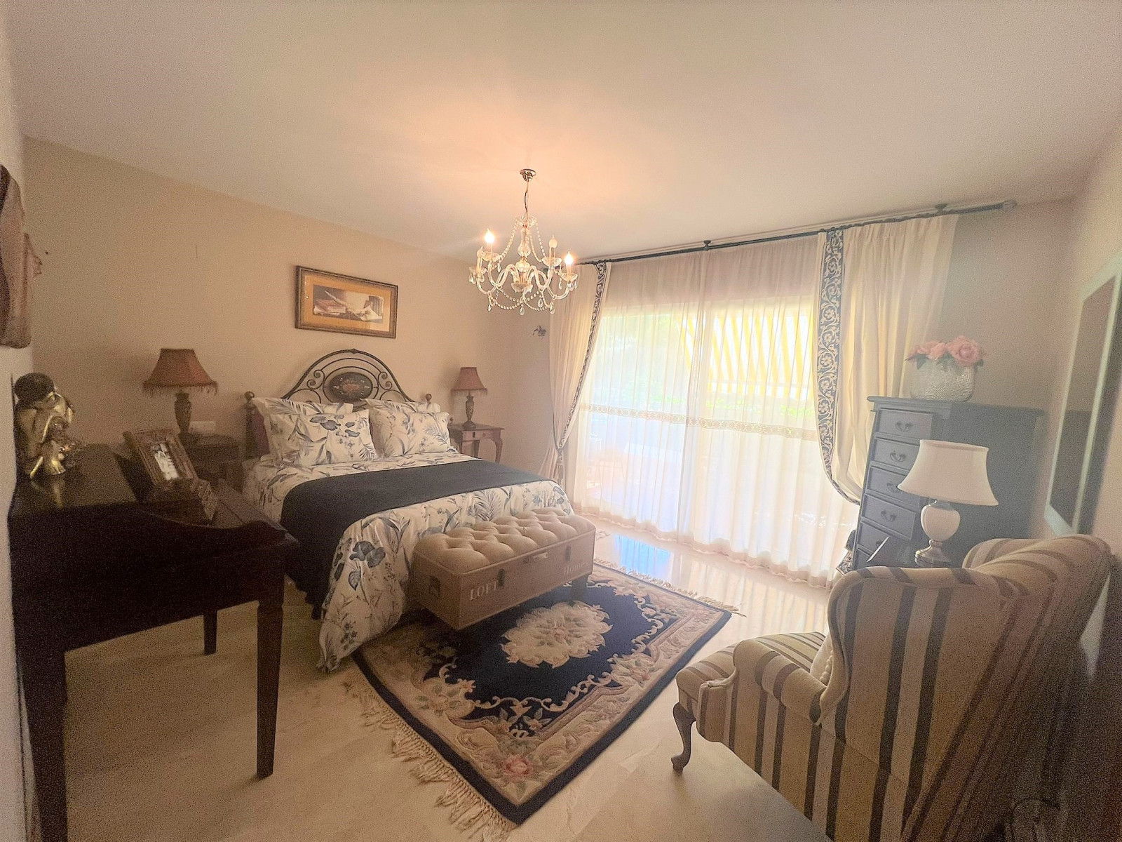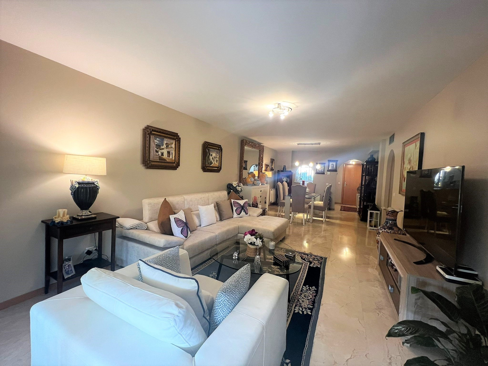 SPECTACULAR GROUND FLOOR FLAT IN URB. GUADALMINA ALTA. It has an entrance hall, living-dining room, fully equipped and independent kitchen, two double bedrooms, the main one en suite, two complete bathrooms with refurbished furniture and sanitary fittings. From the living room and the main bedroom there is access to a spectacular terrace overlooking the garden, possibility to put glass curtains and to have winter and summer terrace. Both bedrooms have large built-in wardrobes and there is the possibility to install glass curtains and to have a winter and summer terrace. Fully fitted kitchen with all electrical appliances. Marble floors, wooden doors. Centralised hot/cold air conditioning. Garage space (large car) and storage room included in the price. The property is located in one of the best urbanisations in Guadalmina Alta, next to the Barcelo hotel. Gated urbanisation with concierge and maintenance service. 7 communal POOLS and children's play area. Surrounded by the best golf courses on the Costa del Sol. A few minutes to San Pedro de Alcántara town, 5 minutes to the Guadalmina Commercial Centre which has all the services, supermarkets, pharmacies and renowned restaurants. Very close to the Paseo Maritimo, only 5 km from Puerto Banus.