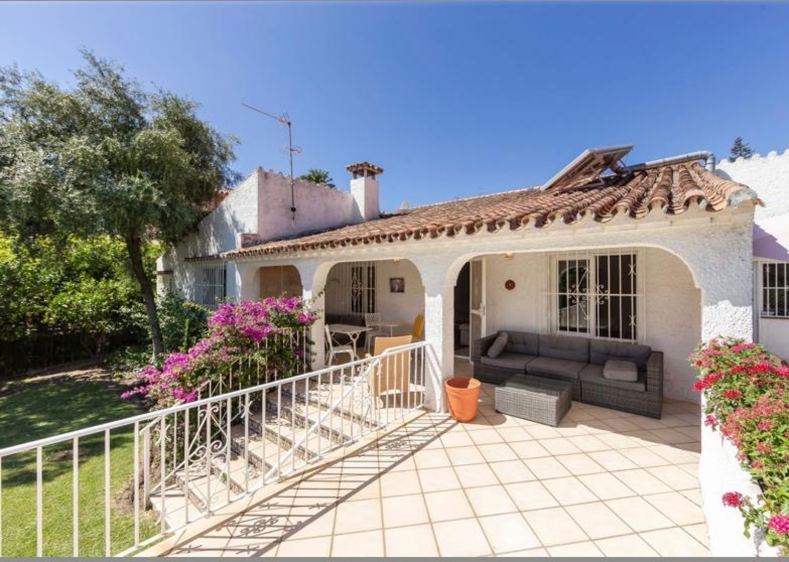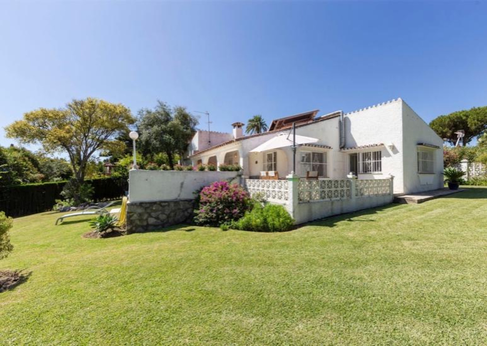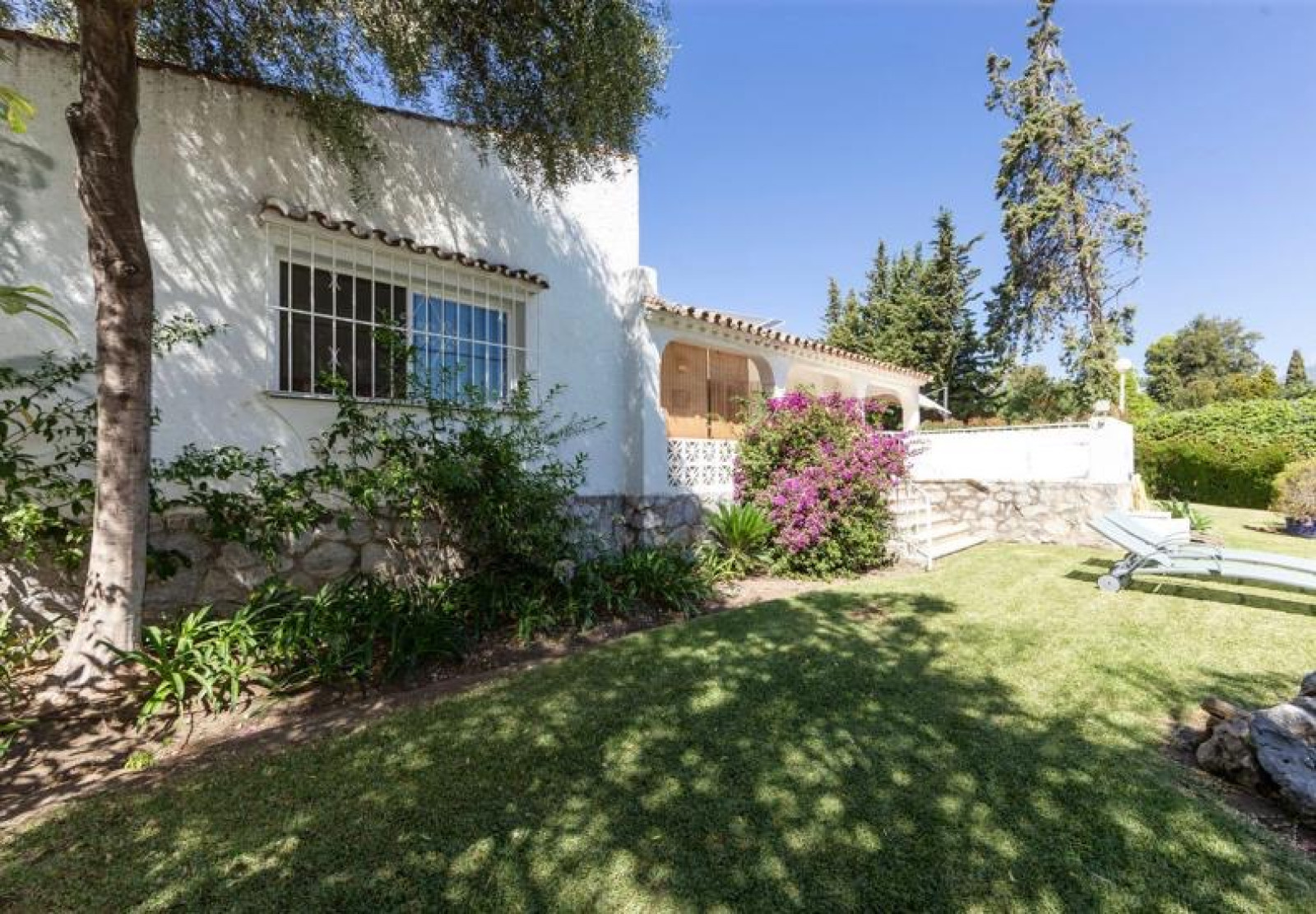 Detached villa, located in the prestigious urbanization of Guadalmina Alta, in Marbella. It borders the Real Club de Golf de Guadalmina. The property has 250 m2, distributed on one floor, and a plot of 1000 m2. It has three bedrooms, three bathrooms, a spacious living room of 50 m2 with fireplace and large windows, office and equipped kitchen with laundry room. From the living room there is access to a spacious and cosy winter porch. Surrounded by golf courses, close to school, shopping centre and public transport. The property is located in a very quiet street. Plot with garden area and garage for few cars and a large storage room. The area is very quiet on the front line of Guadalmina golf. Close to the beach, San Pedro, and Puerto Banus.
