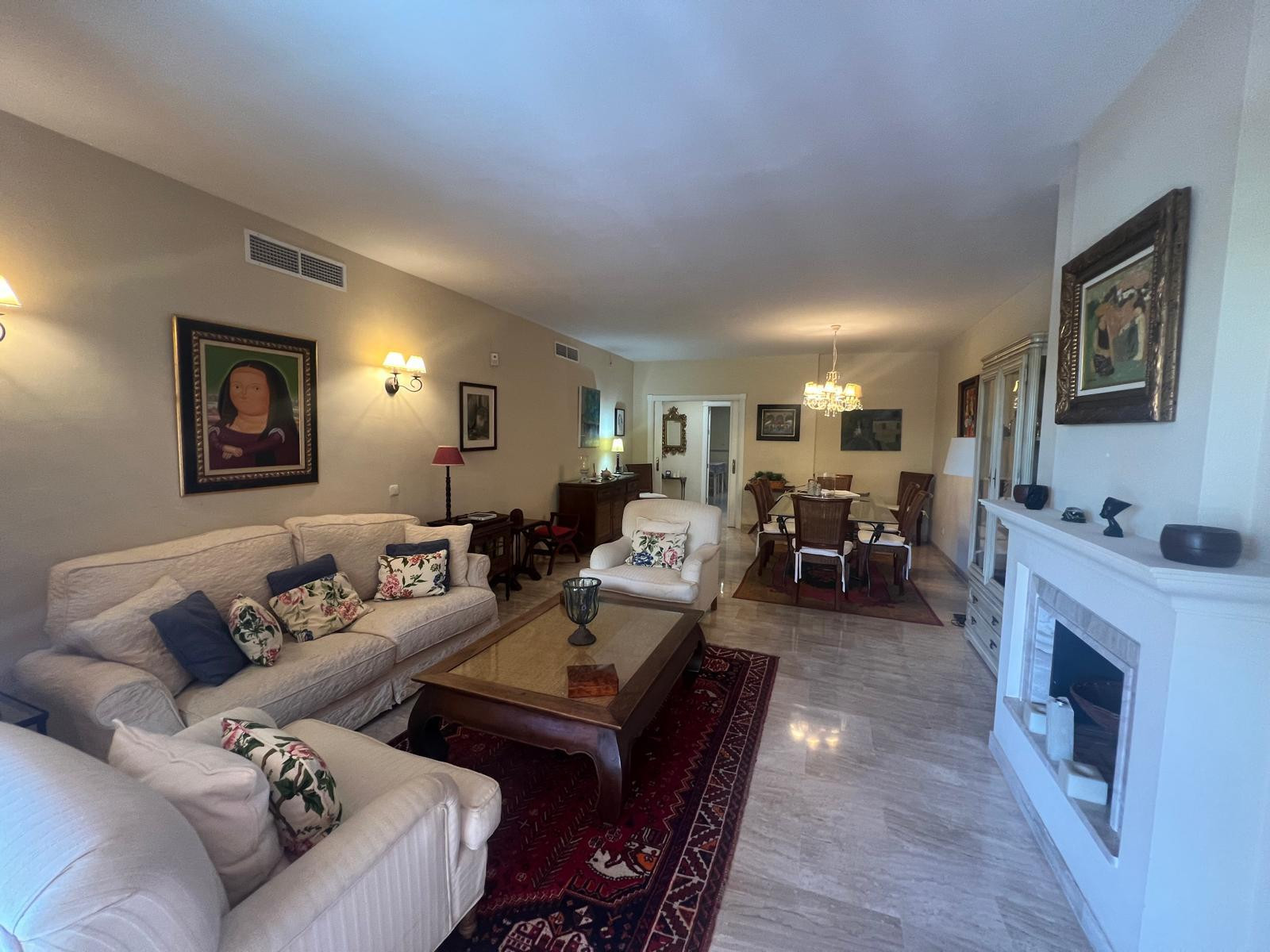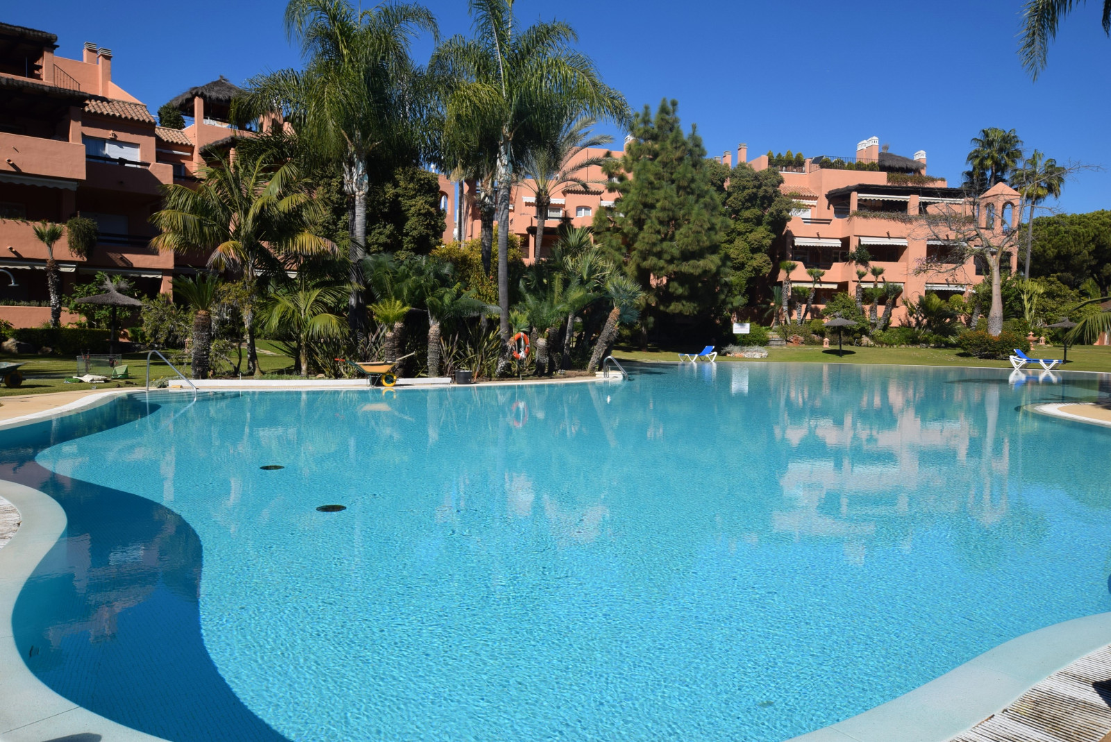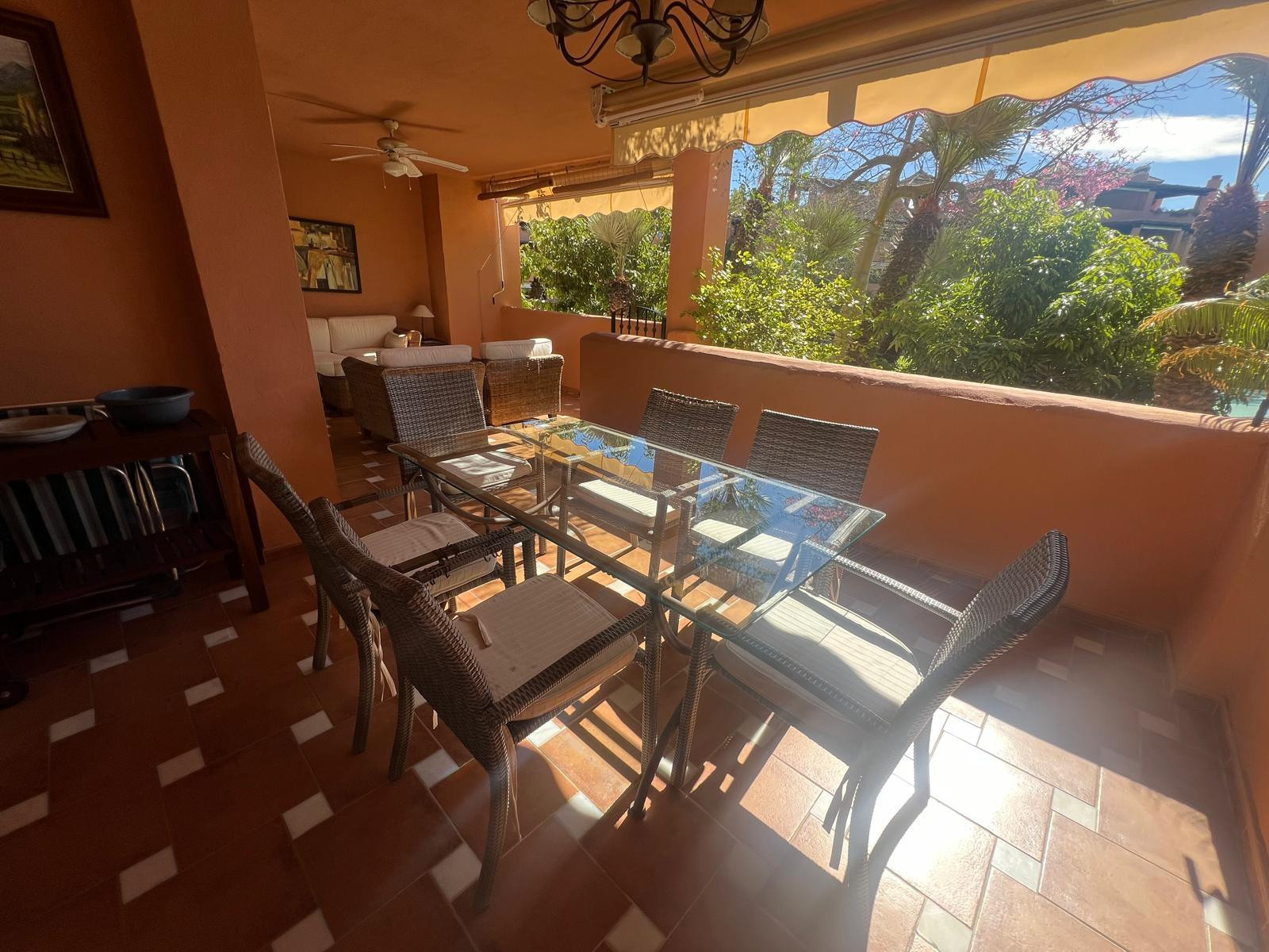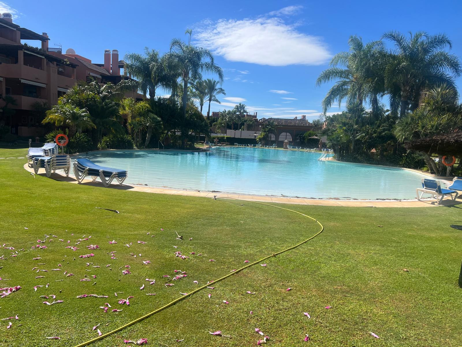 SPECTACULAR GROUND FLOOR IN URB. ALHAMBRA DEL GOLF FASE III Wonderful flat in the urbanization Alhambra del golf, a few meters from the Alhambra Padel Club as well as its proximity to the Real Club de Golf Guadalmina and the beach. 153m2 ground floor with direct access to the pool and main green areas, located in the heart of the urbanization. The property has a master bedroom with en-suite bathroom and access to the terrace, a secondary bedroom and finally a service or complementary bedroom. Spacious living-dining room with fireplace and direct access to a terrace of 30 m2, which allows for a more lounge atmosphere that coexists with an outdoor dining room. Built-in wardrobes in all rooms, air conditioning, a fully equipped kitchen with a room suitable for storing products, food and washing clothes. Finally, it is worth mentioning that the property includes a garage space and its corresponding storage room.