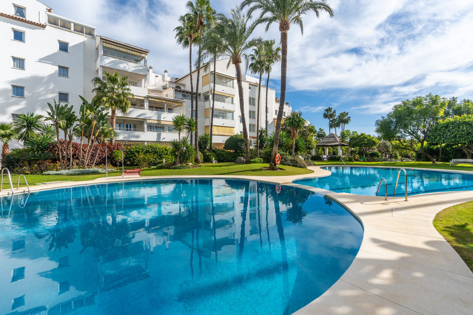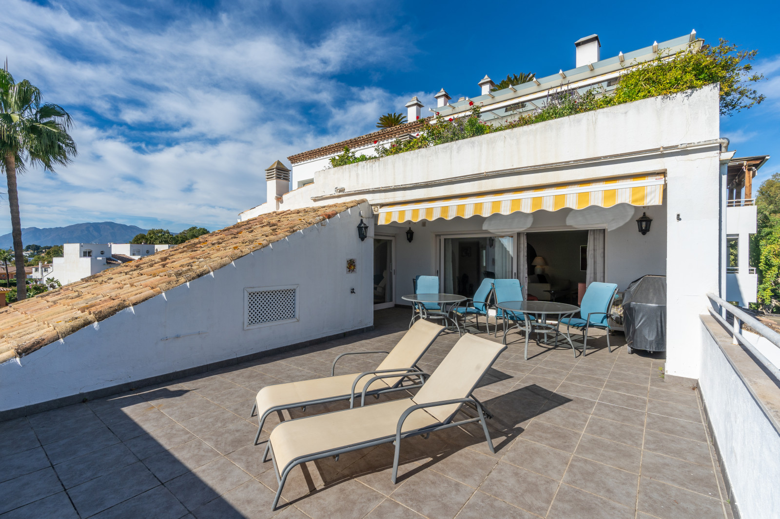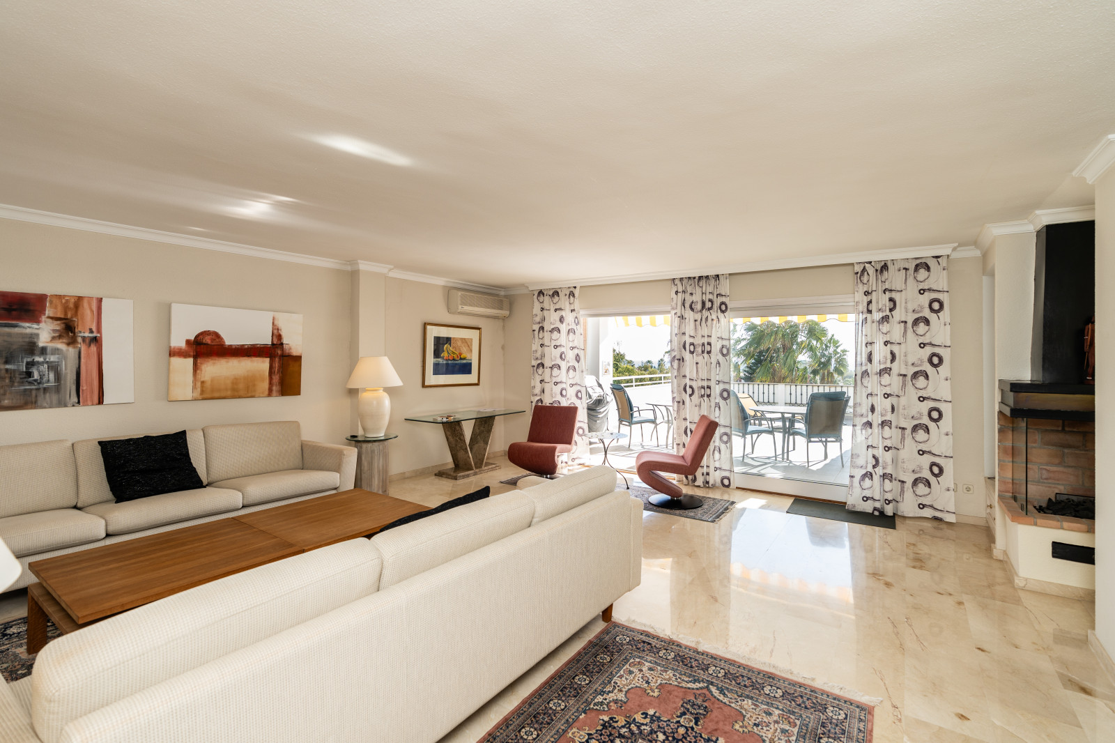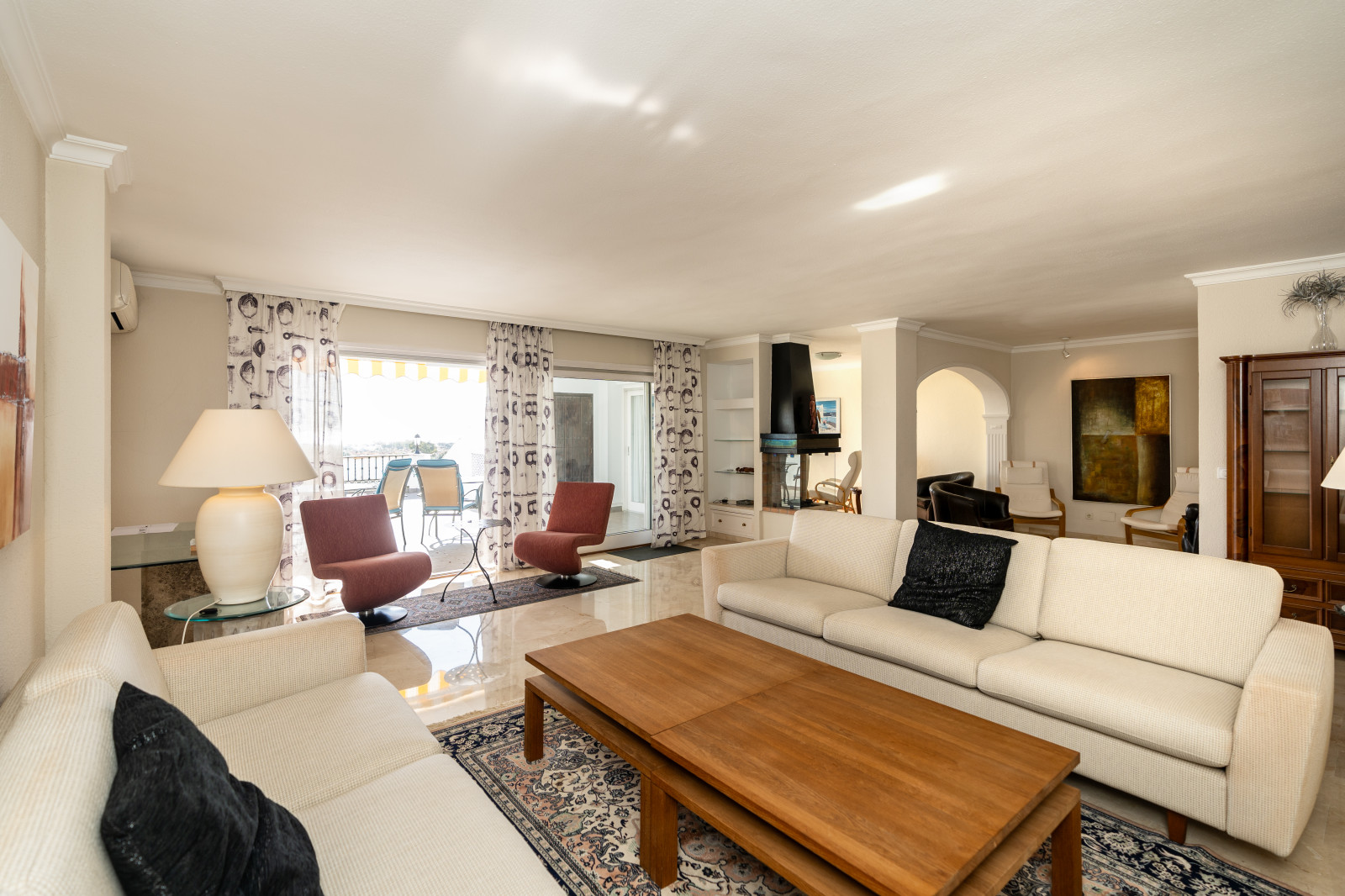 Spectacular double apartment in urb. deluxe. Located in the Nordic Royal Club, a very popular development with the Scandinavian market. Originally two apartments that have been converted into a large apartment of 202m2, and four bedrooms with three bathrooms. The apartment has very high ceilings, a spacious living/dining room with fireplace and direct access to a large terrace, a fully renovated and equipped kitchen, a master bedroom suite, with plenty of built-in storage space. Built-in wardrobes, air conditioning in living room and dining room (splits). The practical and sunny terrace is perfect for relaxing outdoors, it has another terrace. The beautiful community gardens, the swimming pool and all the amenities that the urbanization offers are included in the price of the apartment. It also has two parking spaces and two storage rooms. The apartment has a very high rental potential as the Nordic Royal Club is very popular with the Scandinavian market. It is also perfect as a permanent residence, as the resort offers assisted living, with many amenities such as clubroom, gym, sauna, fitness classes, library, billiard room, 24-hour reception service and medical assistance, among others. The gated community is located east of Estepona, just 1.5 km from El Saladillo beach and 1.7 km from San Pedro beach .