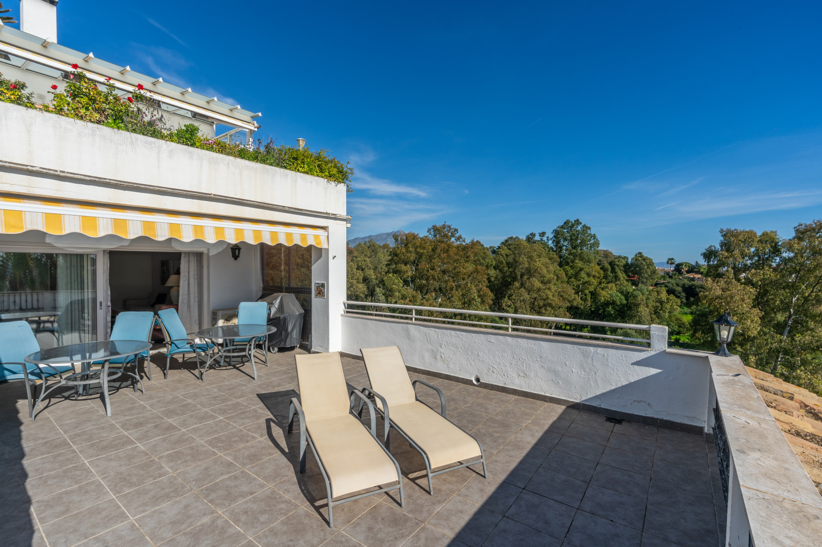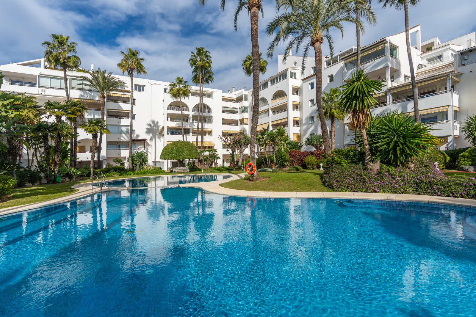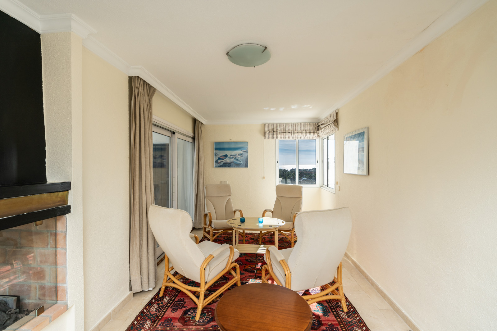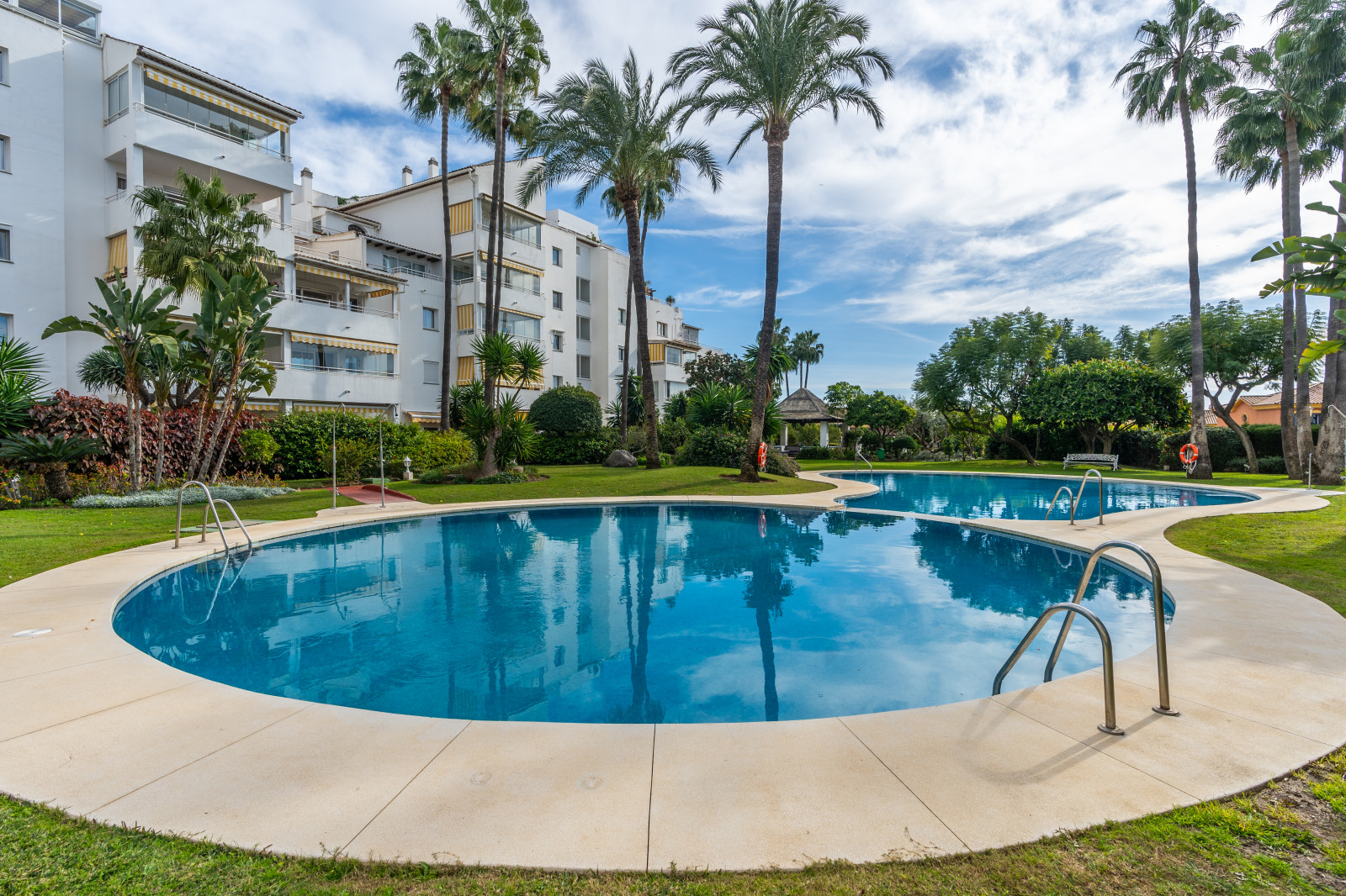 Spectacular double apartment in urb. deluxe. Located in the Nordic Royal Club, a very popular development with the Scandinavian market. Originally two apartments that have been converted into a large apartment of 202m2, and four bedrooms with three bathrooms. The apartment has very high ceilings, a spacious living/dining room with fireplace and direct access to a large terrace, a fully renovated and equipped kitchen, a master bedroom suite, with plenty of built-in storage space. Built-in wardrobes, air conditioning in living room and dining room (splits). The practical and sunny terrace is perfect for relaxing outdoors, it has another terrace. The beautiful community gardens, the swimming pool and all the amenities that the urbanization offers are included in the price of the apartment. It also has two parking spaces and two storage rooms. The apartment has a very high rental potential as the Nordic Royal Club is very popular with the Scandinavian market. It is also perfect as a permanent residence, as the resort offers assisted living, with many amenities such as clubroom, gym, sauna, fitness classes, library, billiard room, 24-hour reception service and medical assistance, among others. The gated community is located east of Estepona, just 1.5 km from El Saladillo beach and 1.7 km from San Pedro beach .
