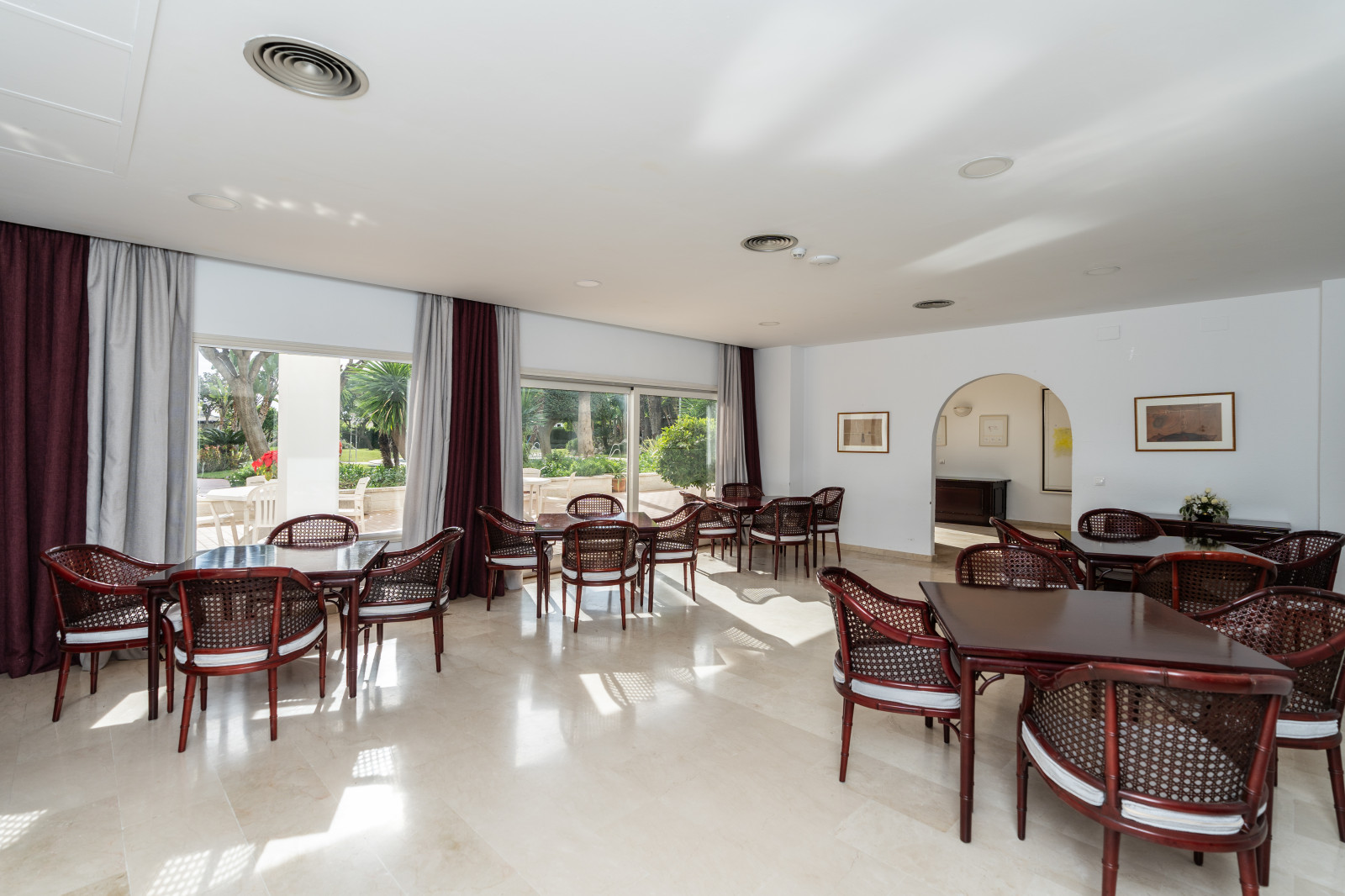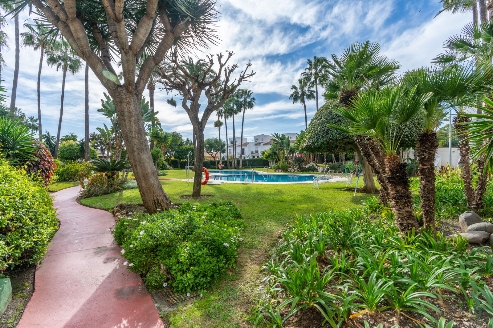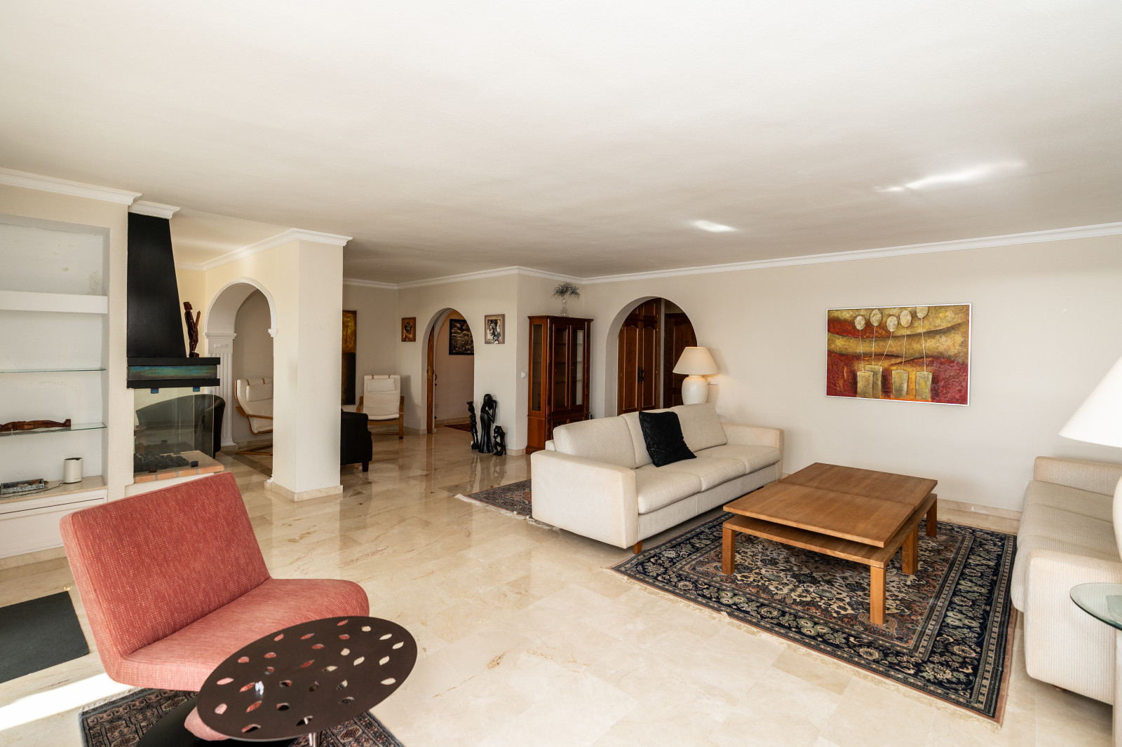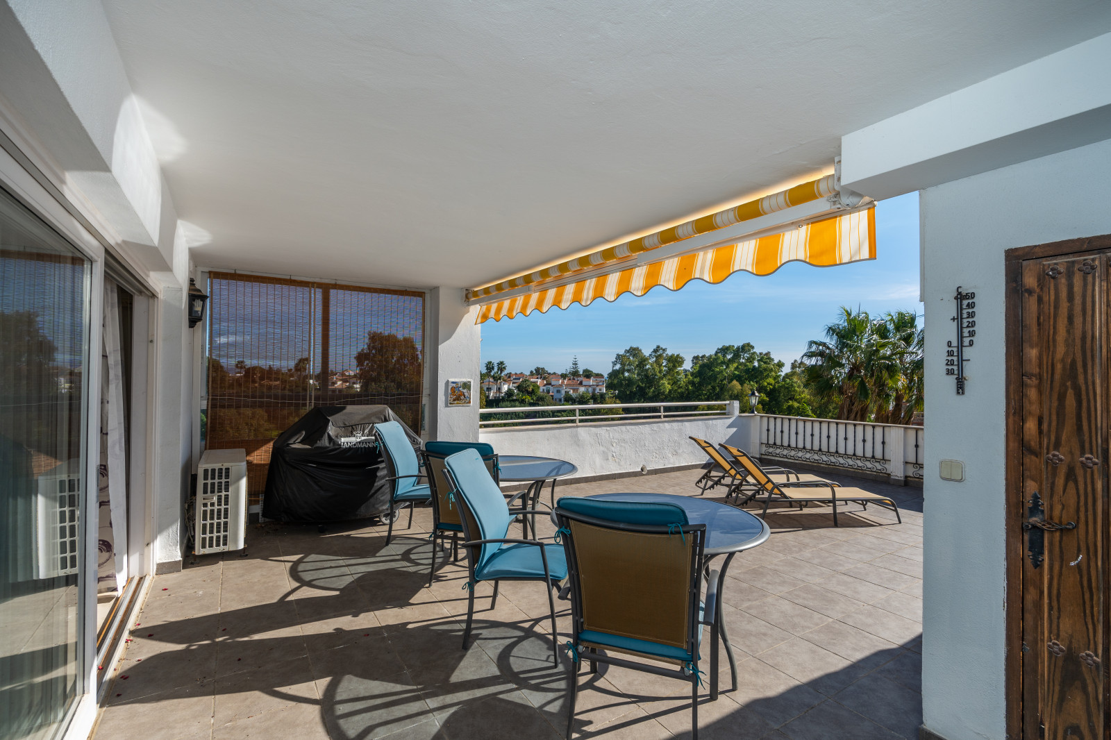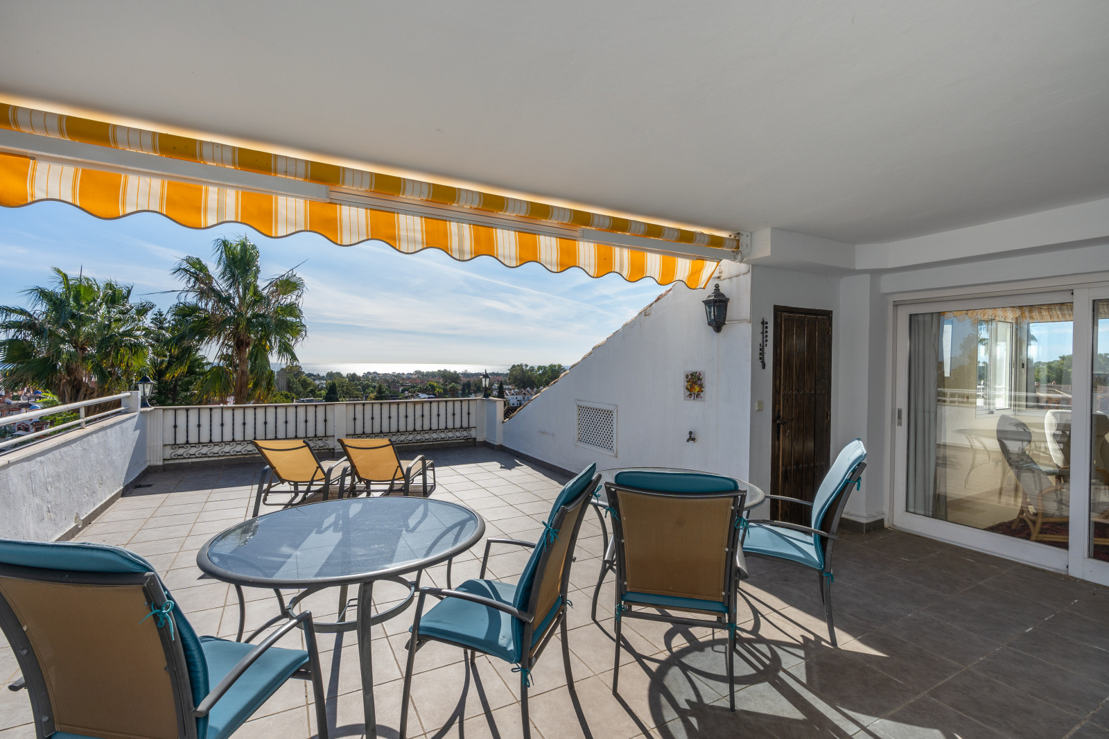 Spectacular double apartment in urb. deluxe. Located in the Nordic Royal Club, a very popular development with the Scandinavian market. Originally two apartments that have been converted into a large apartment of 202m2, and four bedrooms with three bathrooms. The apartment has very high ceilings, a spacious living/dining room with fireplace and direct access to a large terrace, a fully renovated and equipped kitchen, a master bedroom suite, with plenty of built-in storage space. Built-in wardrobes, air conditioning in living room and dining room (splits). The practical and sunny terrace is perfect for relaxing outdoors, it has another terrace. The beautiful community gardens, the swimming pool and all the amenities that the urbanization offers are included in the price of the apartment. It also has two parking spaces and two storage rooms. The apartment has a very high rental potential as the Nordic Royal Club is very popular with the Scandinavian market. It is also perfect as a permanent residence, as the resort offers assisted living, with many amenities such as clubroom, gym, sauna, fitness classes, library, billiard room, 24-hour reception service and medical assistance, among others. The gated community is located east of Estepona, just 1.5 km from El Saladillo beach and 1.7 km from San Pedro beach .