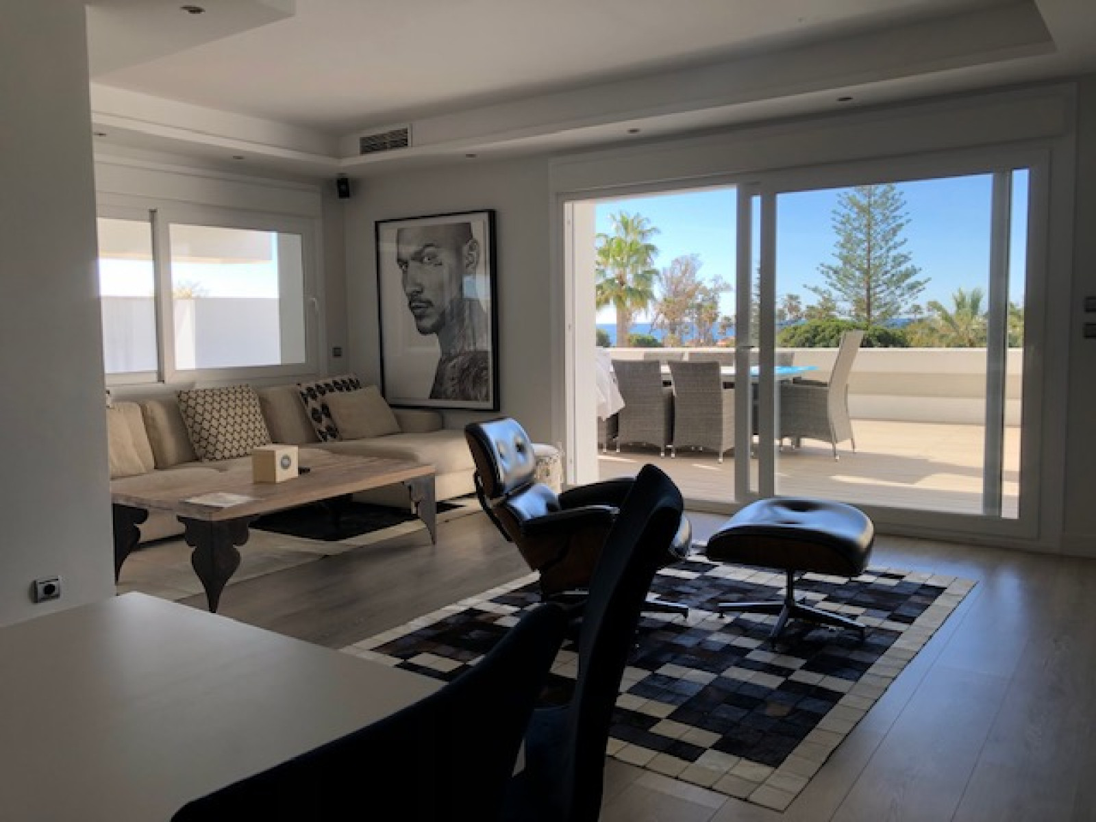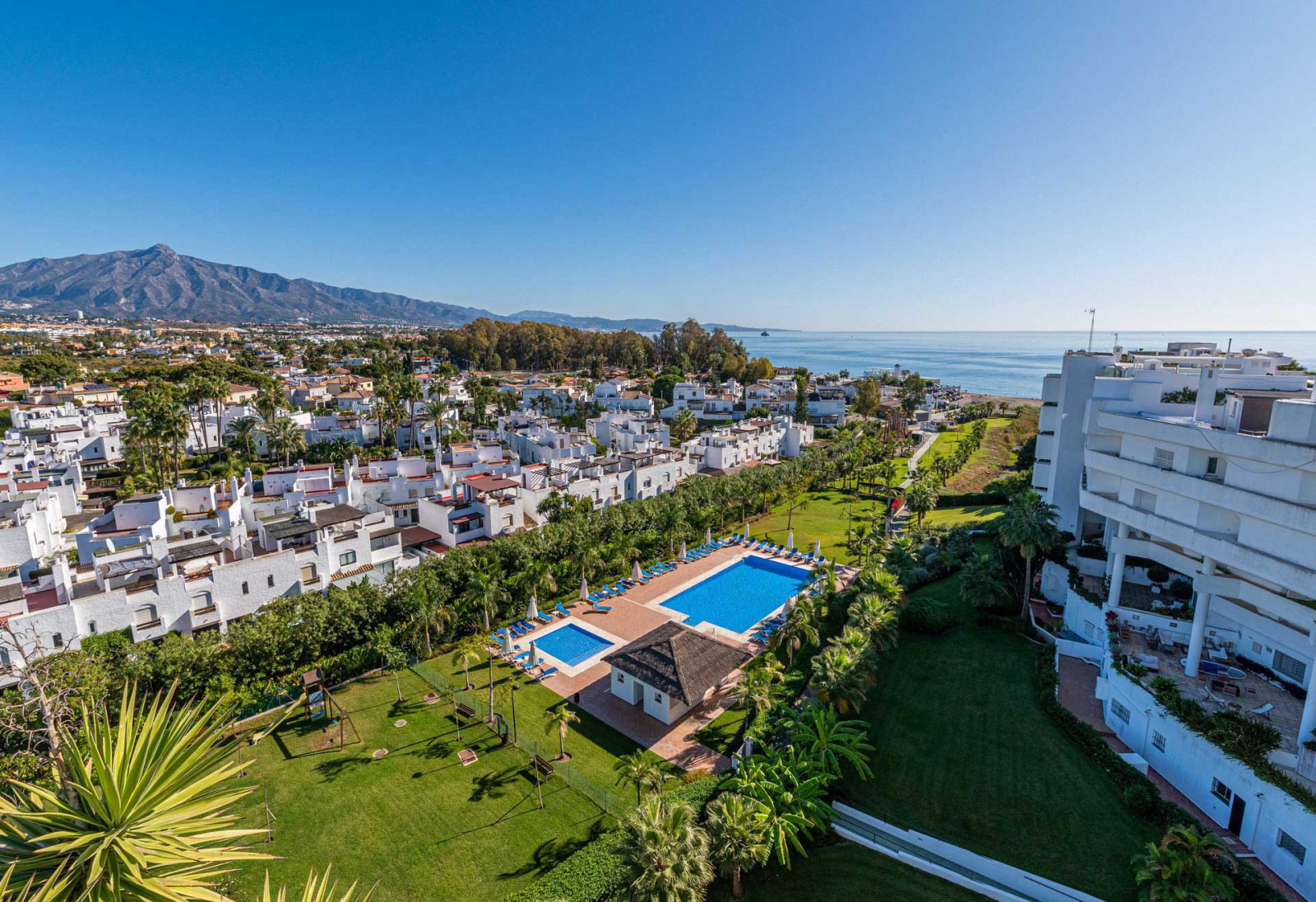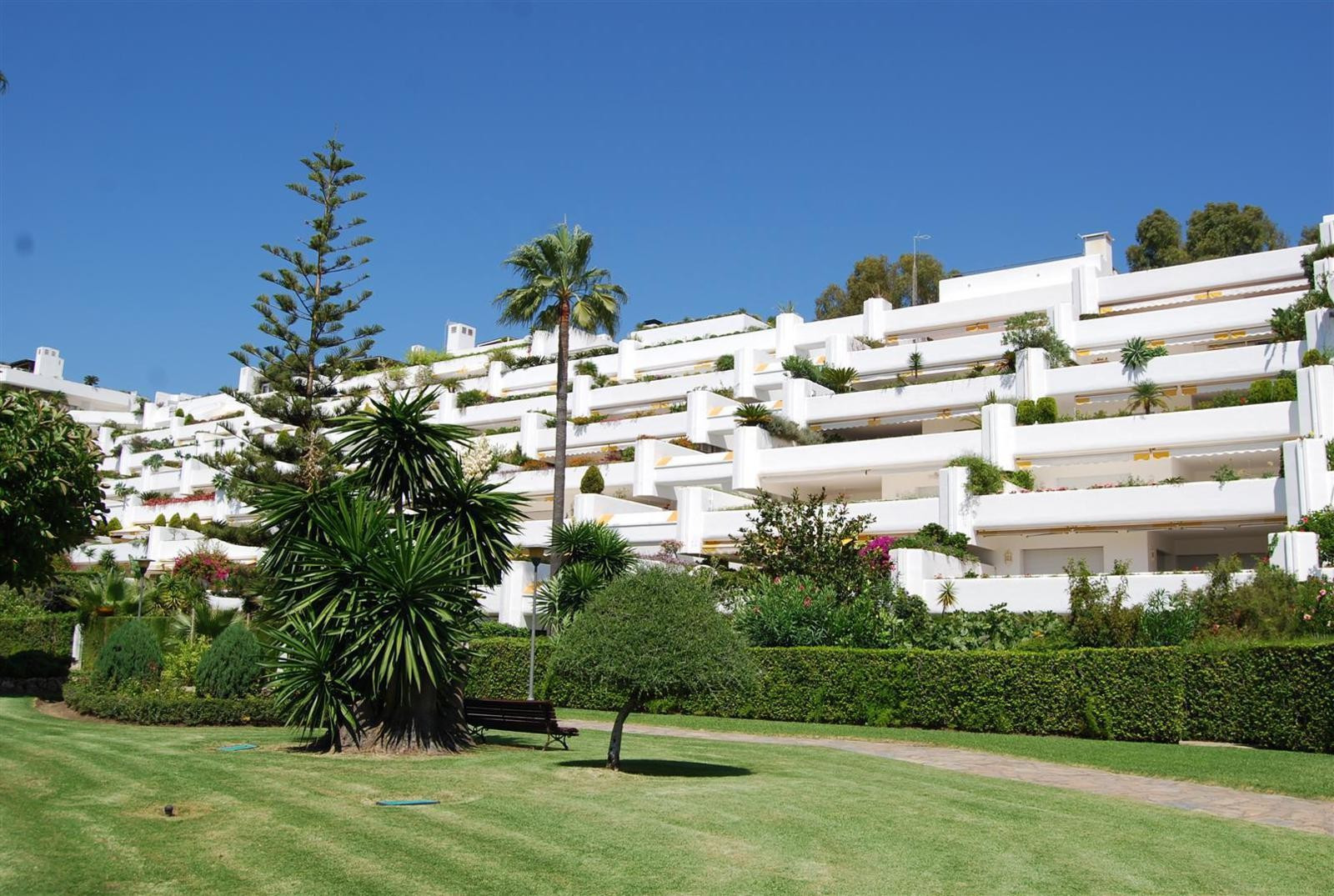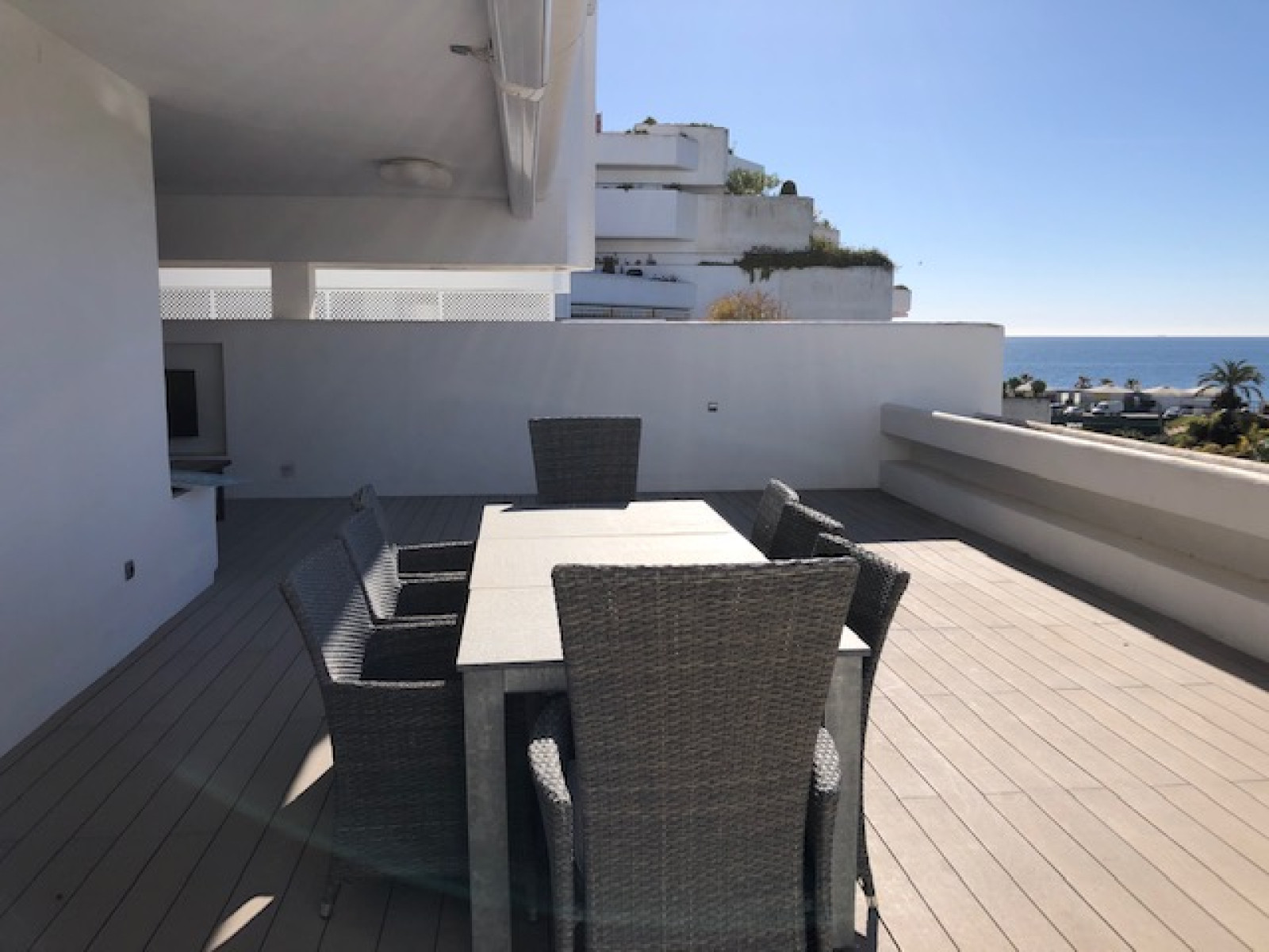 SPACIOUS APARTMENT WITH SEA VIEWS. Spectacular flat with excellent sea views in one of the best developments in Guadalmina Baja, Parque del Sol, a front line beach development. This flat stands out for its brightness and its sea views. It has 2 double bedrooms, each with en suite bathroom. The kitchen, fully renovated and equipped, integrates perfectly with the spacious living-dining room, creating an ideal environment to enjoy unforgettable moments, in addition it can easily be closed, spacious living-dining room that gives access to a large terrace of 88 m², with relax and dining area to enjoy the views of the Mediterranean. The flat has air conditioning, fitted wardrobes, double glazed windows. An underground parking space is included in the price. The urbanisation offers top quality services such as 24 hour security, large landscaped gardens, a communal swimming pool and direct access to the beach.
