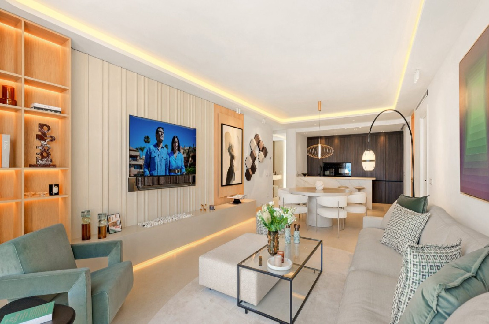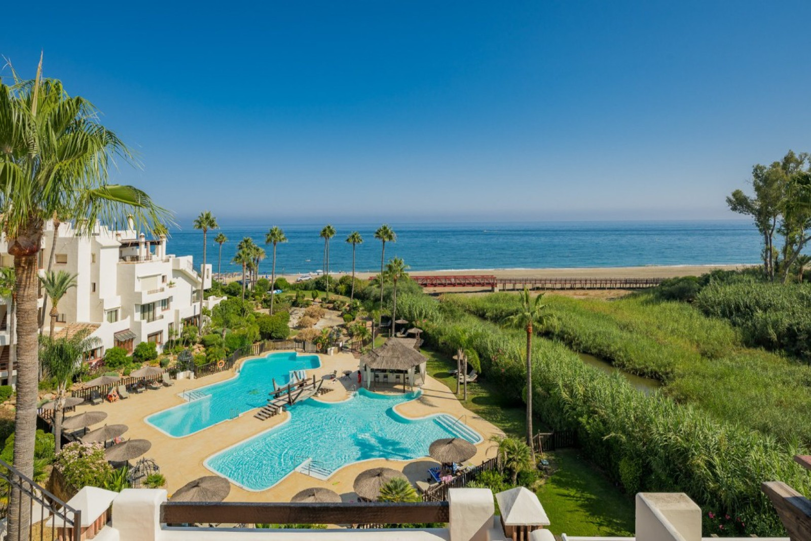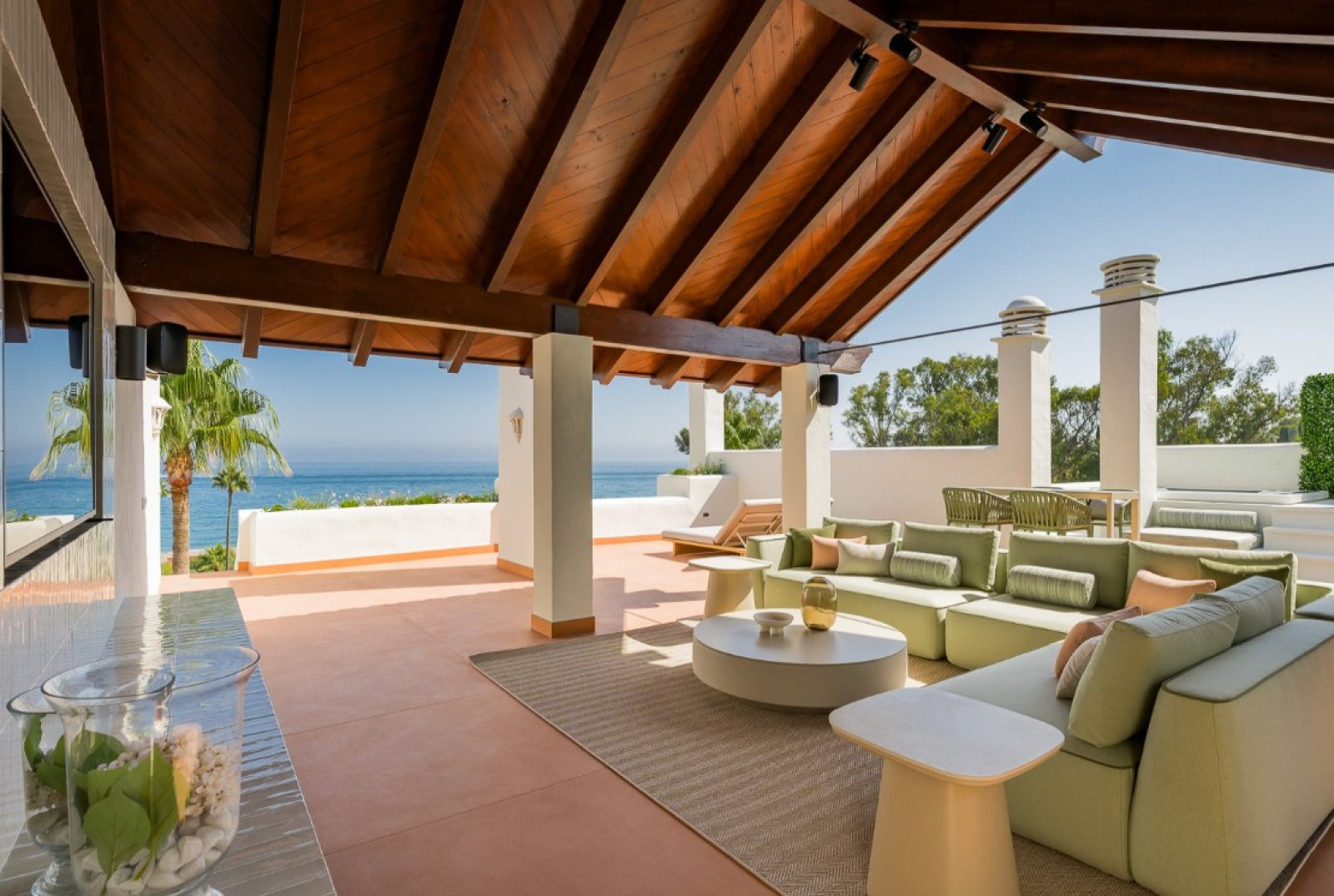 Exclusive Renovated Beachfront Penthouse: Bahía del Velerín This spectacular penthouse has been completely transformed with a high-end contemporary design and an open-plan layout that redefines luxury on the Costa del Sol. Located in the prestigious community of Bahía del Velerín, between Marbella and Estepona, the property stands out for its attention to detail: designer furniture, bespoke fitted wardrobes, a Bang & Olufsen sound system and an elegant modern fireplace. Its crowning glory is the immense rooftop terrace, a private retreat with wellness and dining areas offering uninterrupted panoramic views of the Mediterranean. The development, situated on one of the area’s finest beaches, features 24/7 security, lush tropical gardens, a swimming pool with a snack bar, as well as an underground parking space and a storage room. A unique opportunity for those seeking an exclusive, move-in-ready property offering maximum privacy right by the sea.
