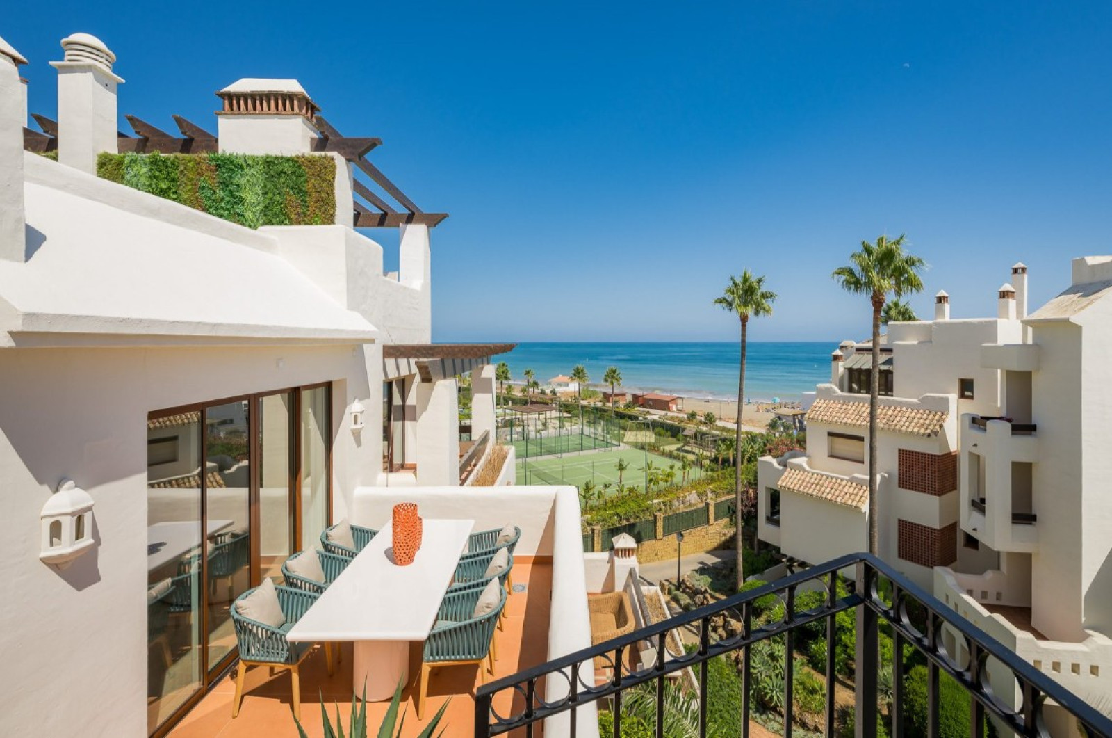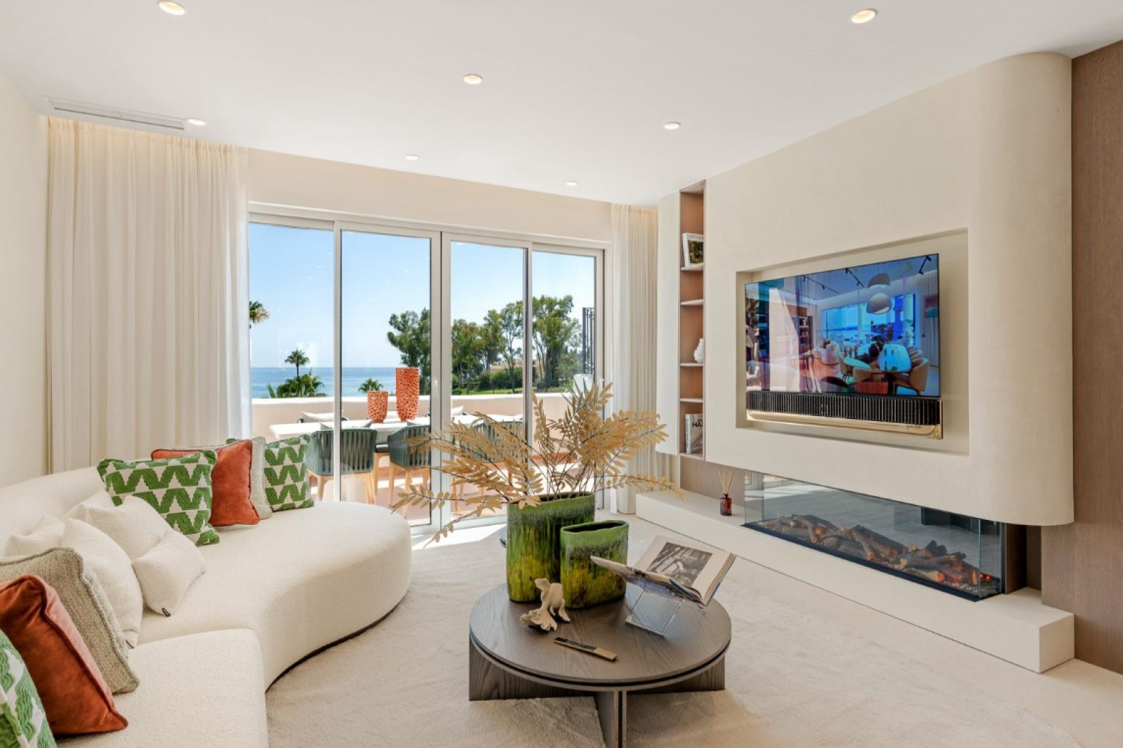 Exclusive Renovated Beachfront Property: Bahía del Velerín This spectacular home has been completely transformed with a sophisticated, contemporary open-plan design, featuring top-of-the-range materials and appliances. Located in the prestigious Bahía del Velerín development, between Marbella and Estepona, the property stands out for its luxurious touches, such as its Bang & Olufsen sound system, modern fireplace, bespoke fitted wardrobes and a designer freestanding bath. Its crowning glory is the immense private terrace, a unique space featuring wellness and dining areas offering uninterrupted panoramic views of the Mediterranean. The development, situated on one of the area’s finest beaches, boasts 24/7 security, lush tropical gardens and a large swimming pool with a snack bar, as well as an underground parking space and a storage room. It is an exceptional property, ready to move into, designed for those seeking maximum privacy and exclusivity by the sea.