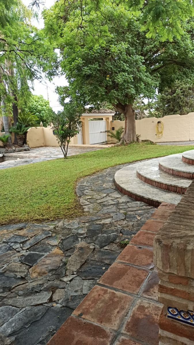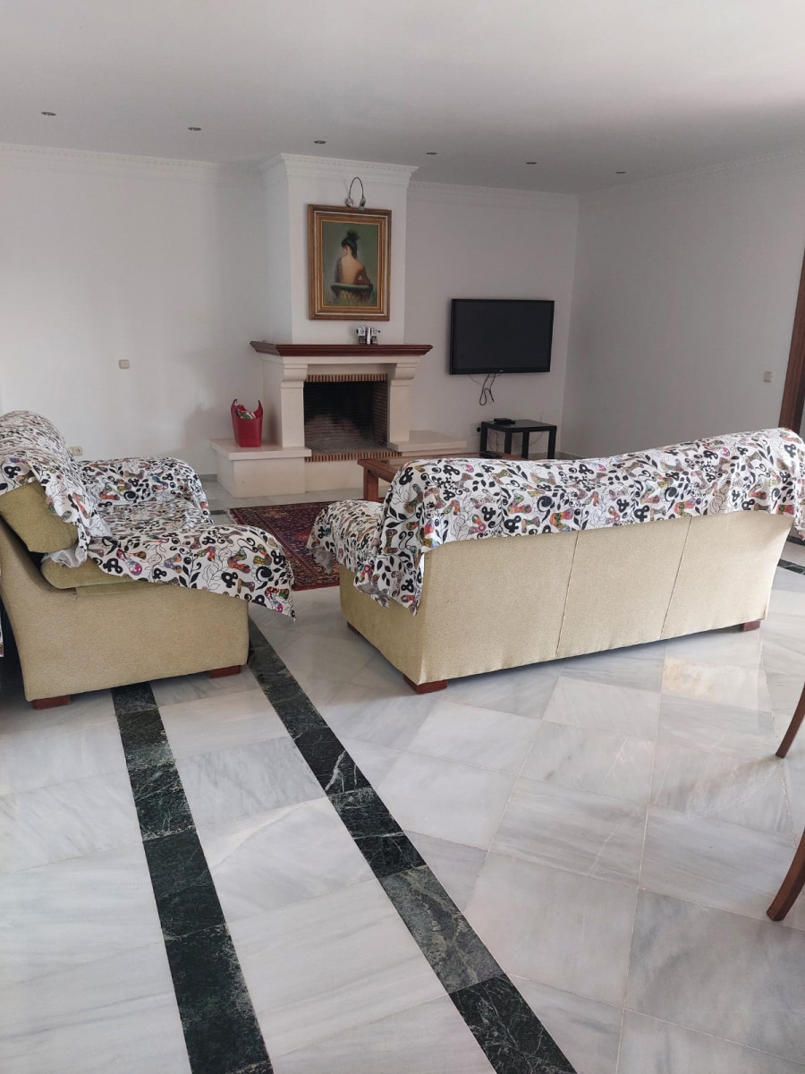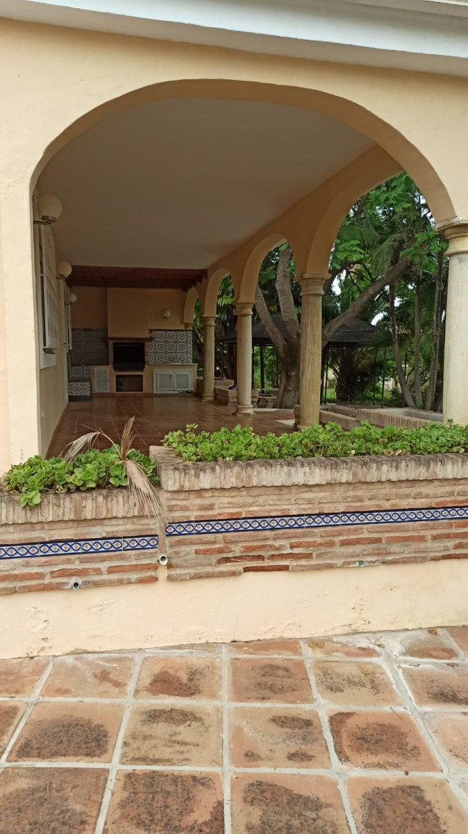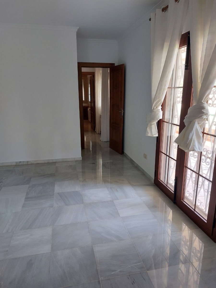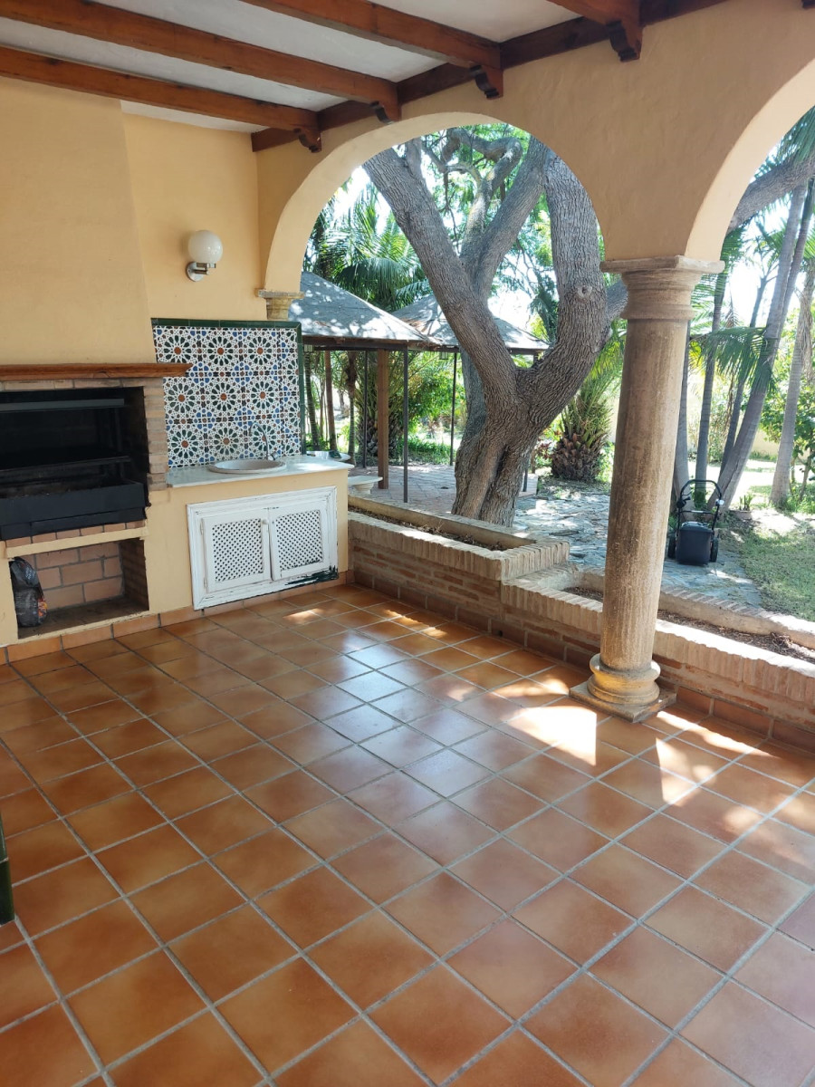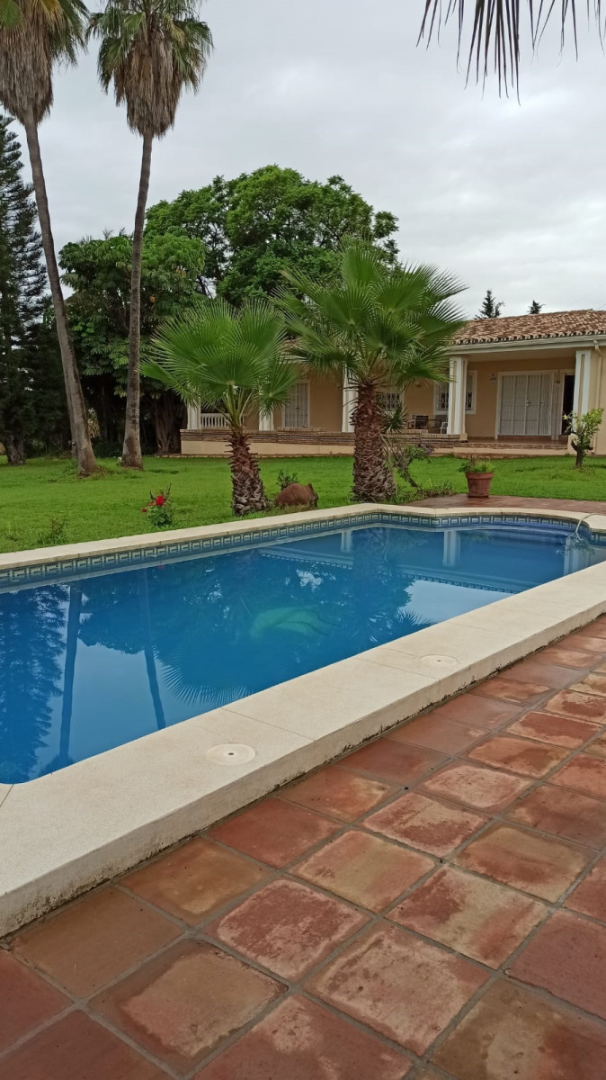 Bonita villa en alquiler Larga temporada en zona Selwo. Villa de gran tamaño, con orientación sureste. Dispone de gran salón comedor con chimenea, cuatro dormitorios, un despacho, cocina equipada, habitación independiente para invitados o servicio, y con gran parcela con piscina, jardín y fuente. Incluye el agua ya que tiene pozo propio. Dispone de alarma y la jardinería está incluida.