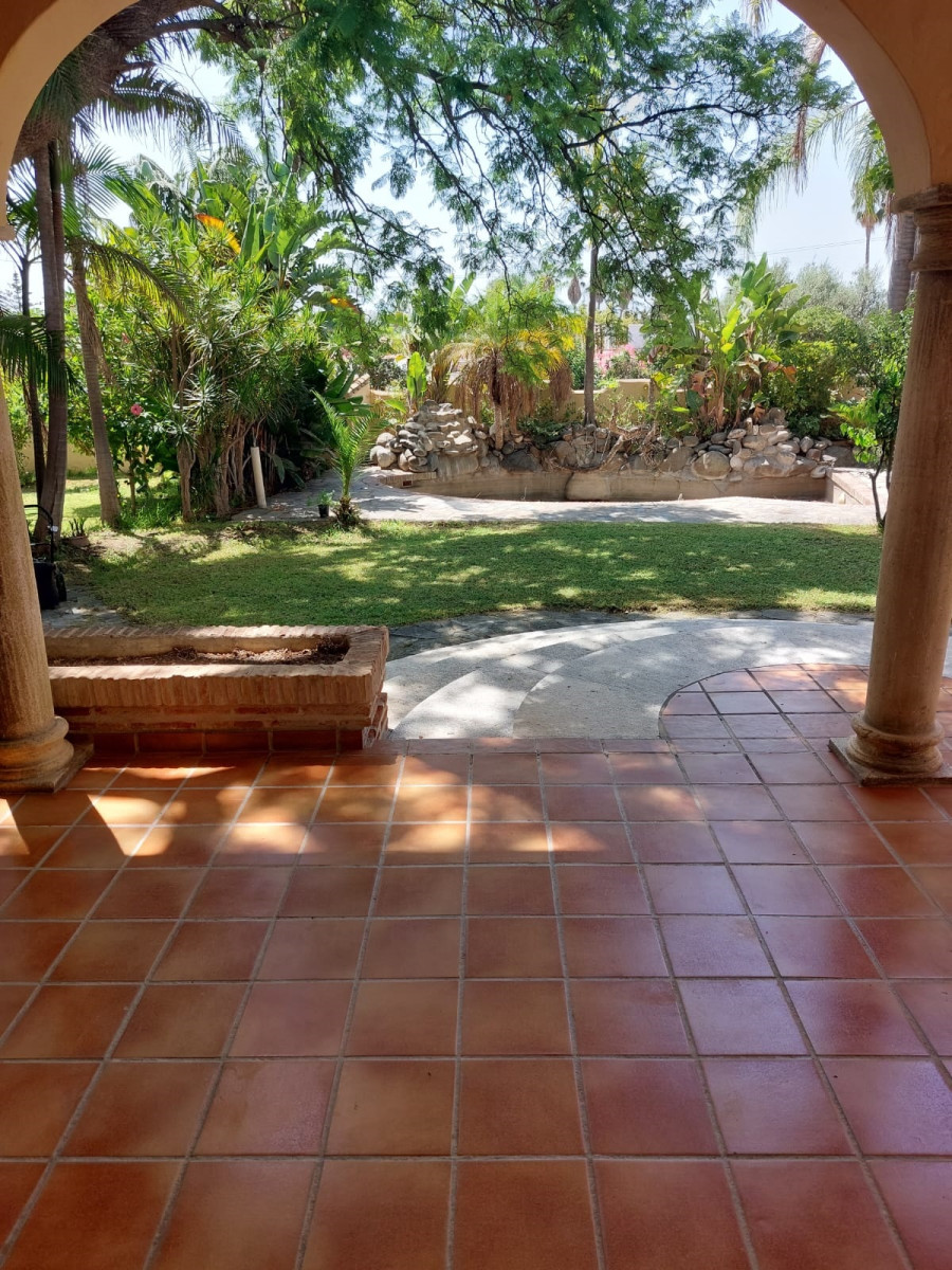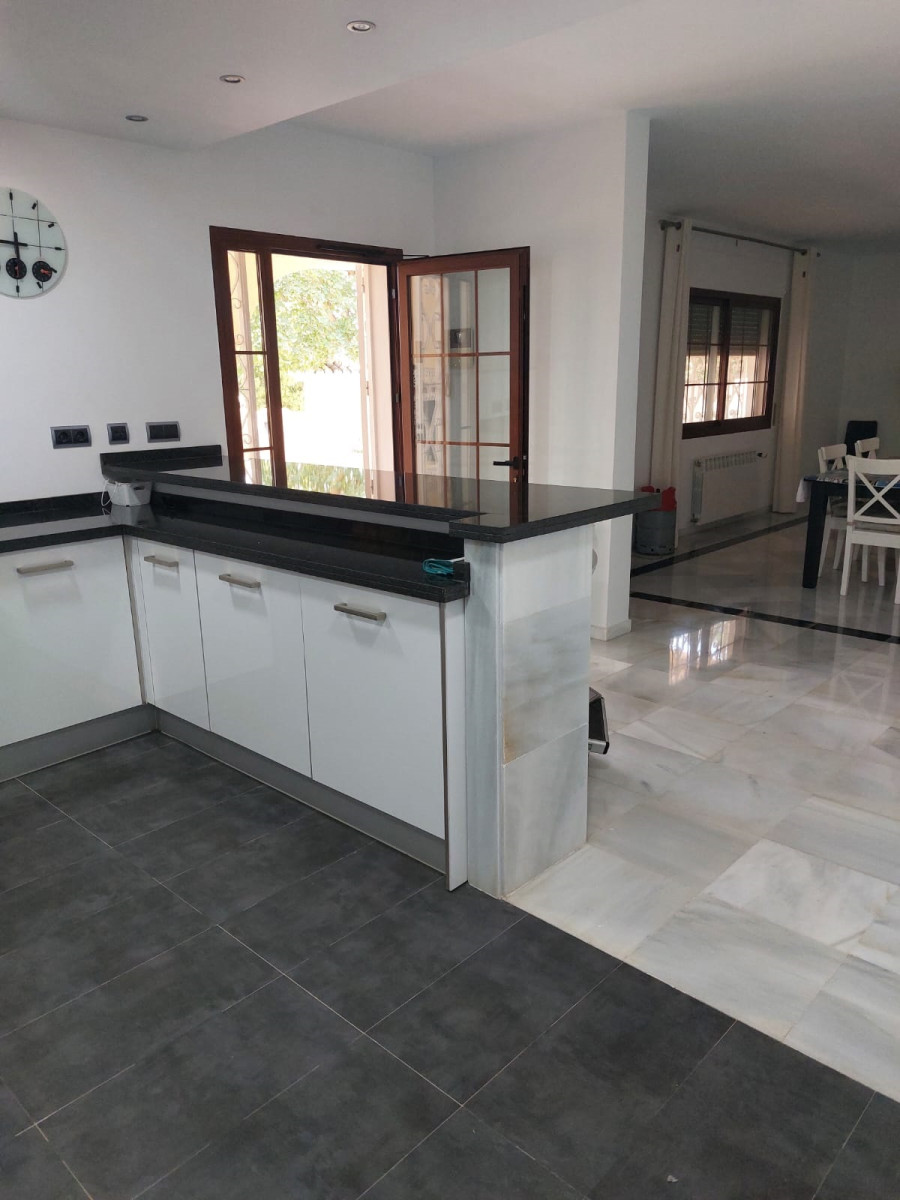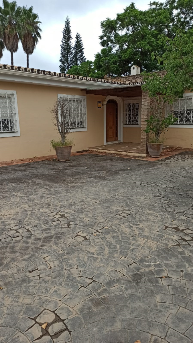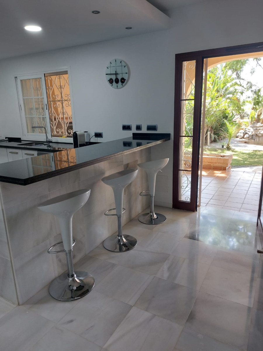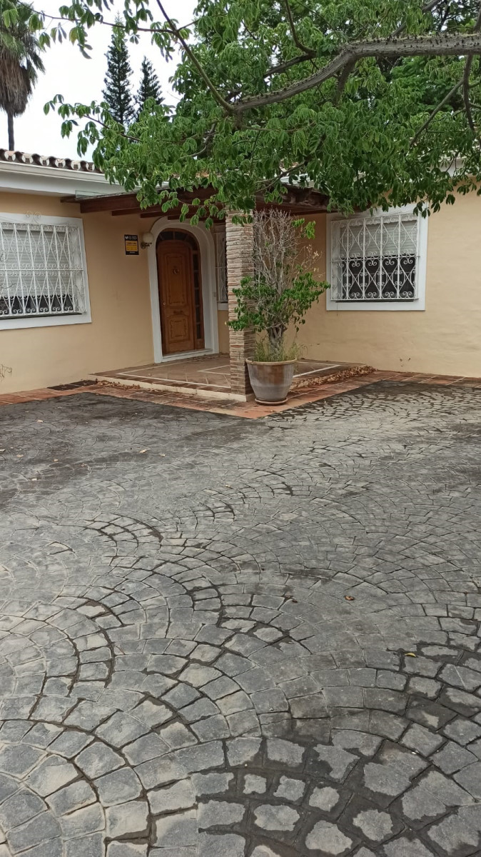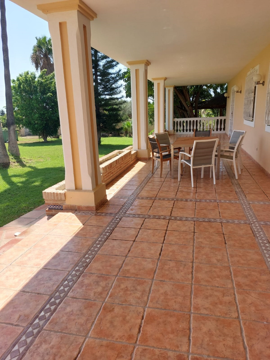 Bonita villa en alquiler Larga temporada en zona Selwo. Villa de gran tamaño, con orientación sureste. Dispone de gran salón comedor con chimenea, cuatro dormitorios, un despacho, cocina equipada, habitación independiente para invitados o servicio, y con gran parcela con piscina, jardín y fuente. Incluye el agua ya que tiene pozo propio. Dispone de alarma y la jardinería está incluida.