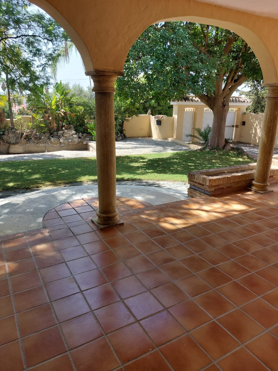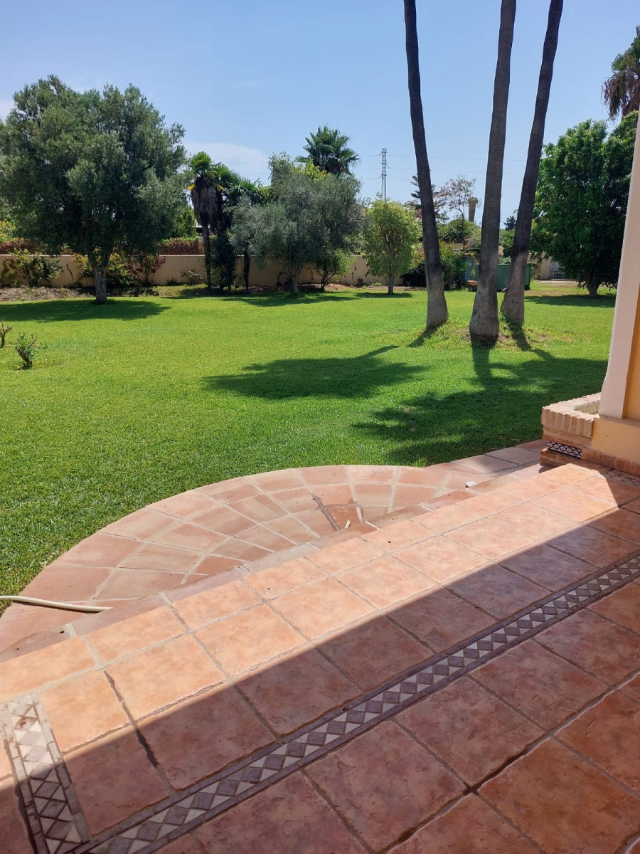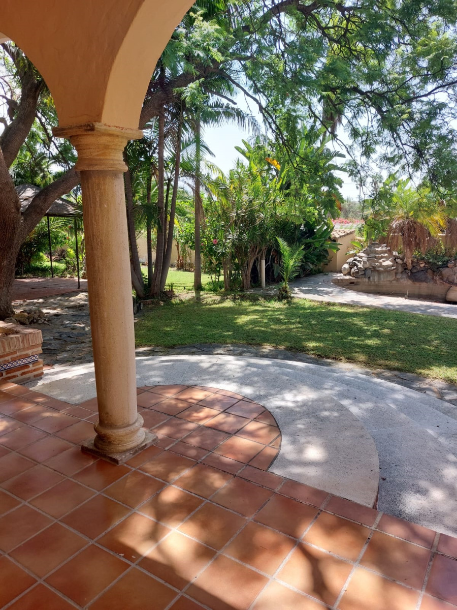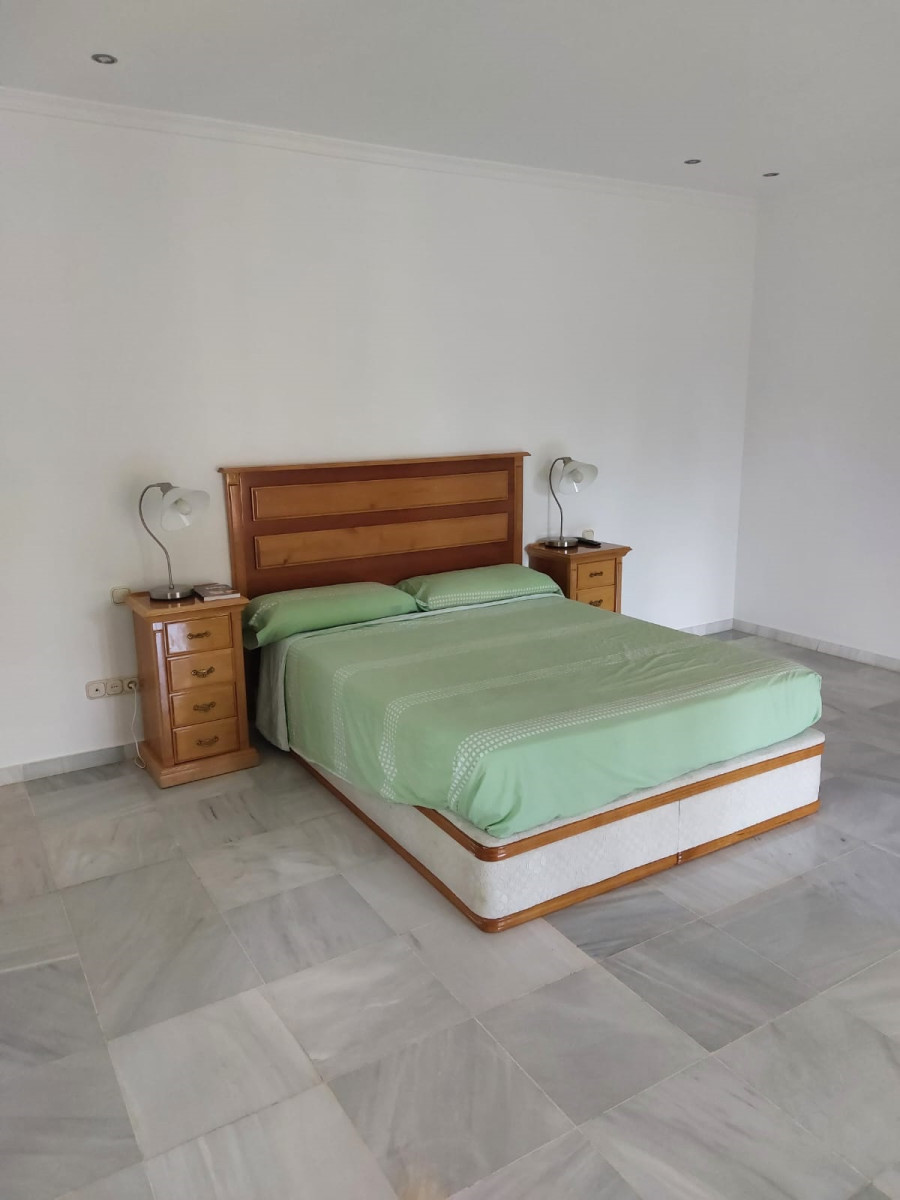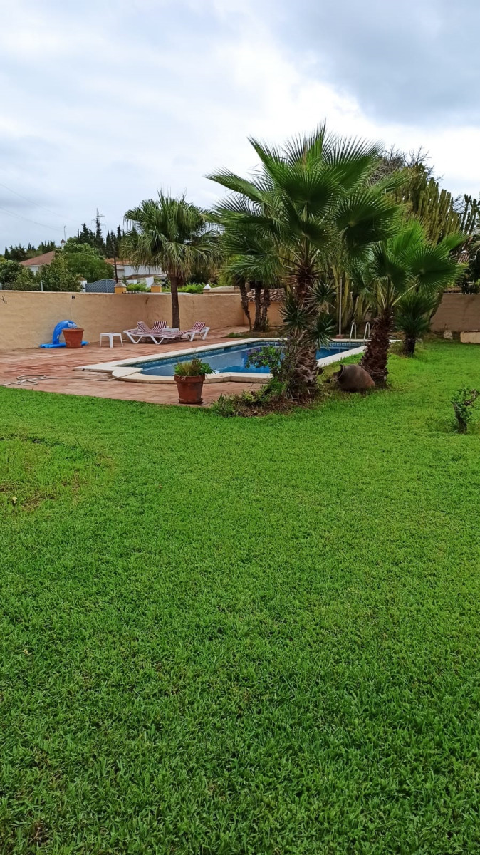 Bonita villa en alquiler Larga temporada en zona Selwo. Villa de gran tamaño, con orientación sureste. Dispone de gran salón comedor con chimenea, cuatro dormitorios, un despacho, cocina equipada, habitación independiente para invitados o servicio, y con gran parcela con piscina, jardín y fuente. Incluye el agua ya que tiene pozo propio. Dispone de alarma y la jardinería está incluida.