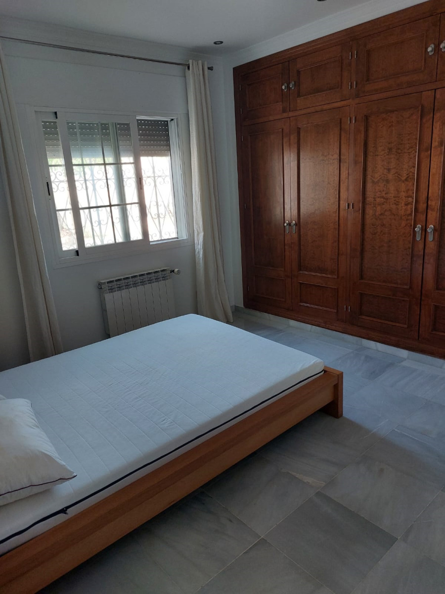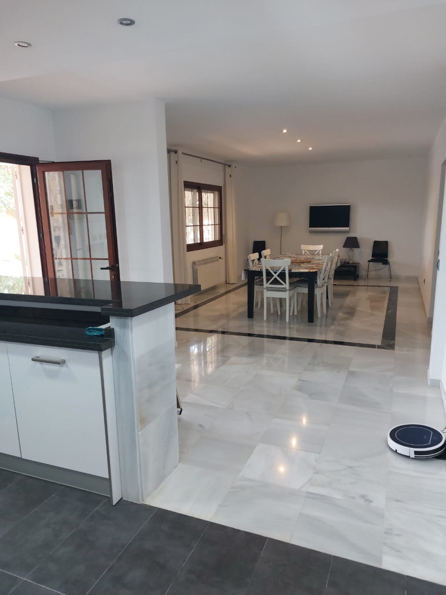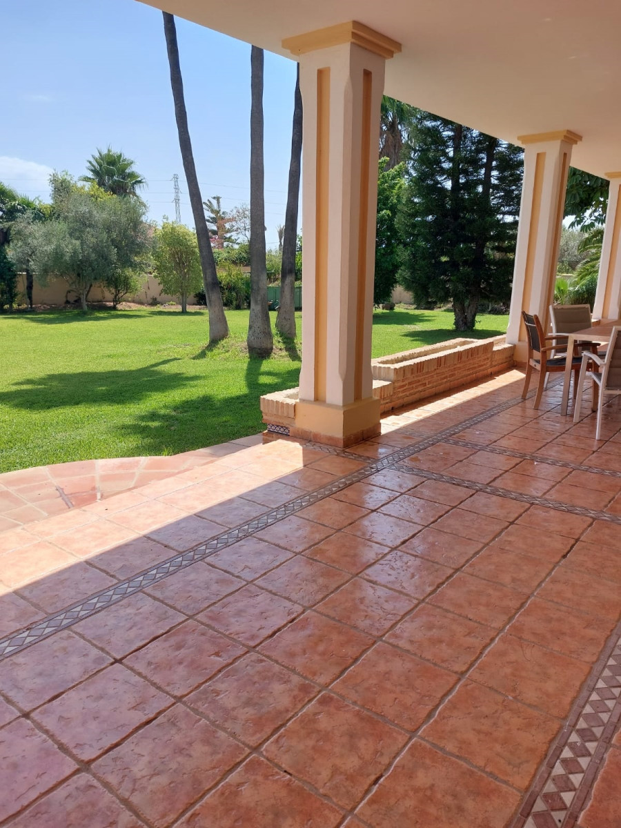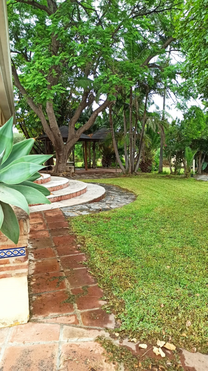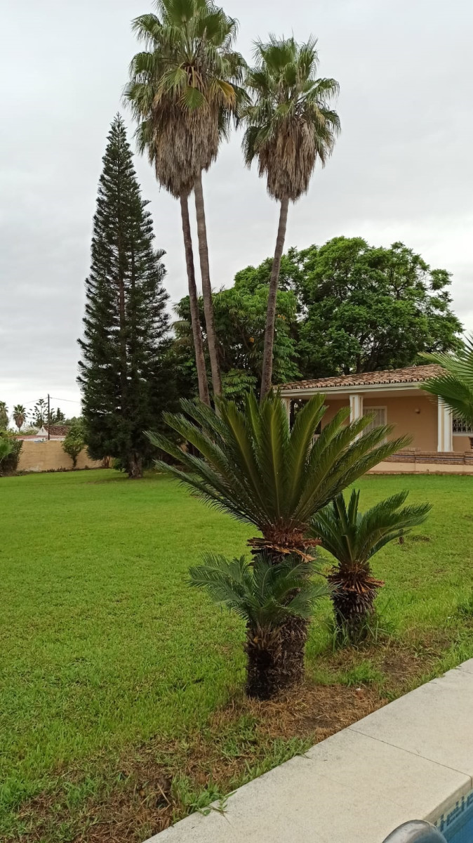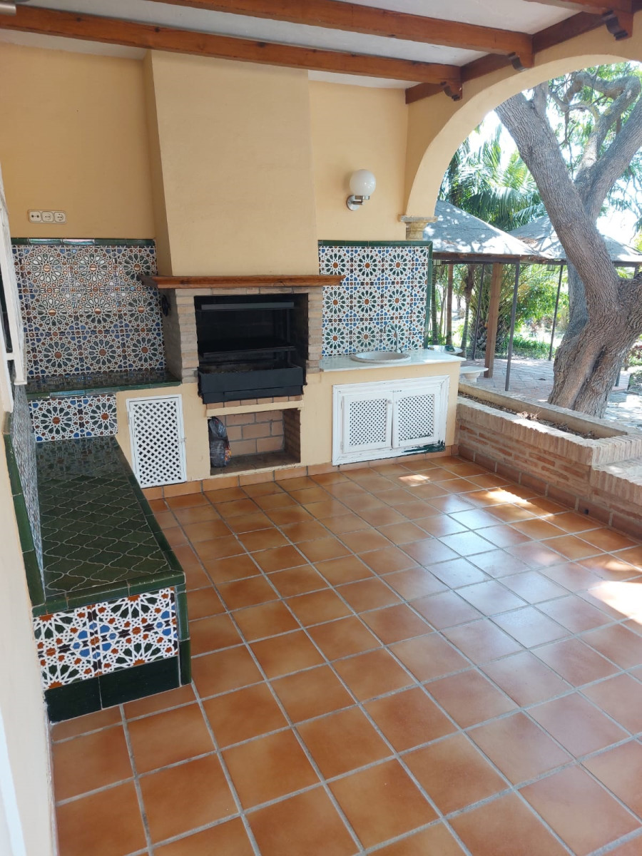 Bonita villa en alquiler Larga temporada en zona Selwo. Villa de gran tamaño, con orientación sureste. Dispone de gran salón comedor con chimenea, cuatro dormitorios, un despacho, cocina equipada, habitación independiente para invitados o servicio, y con gran parcela con piscina, jardín y fuente. Incluye el agua ya que tiene pozo propio. Dispone de alarma y la jardinería está incluida.