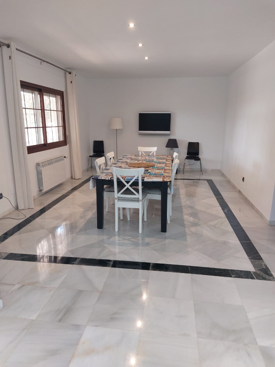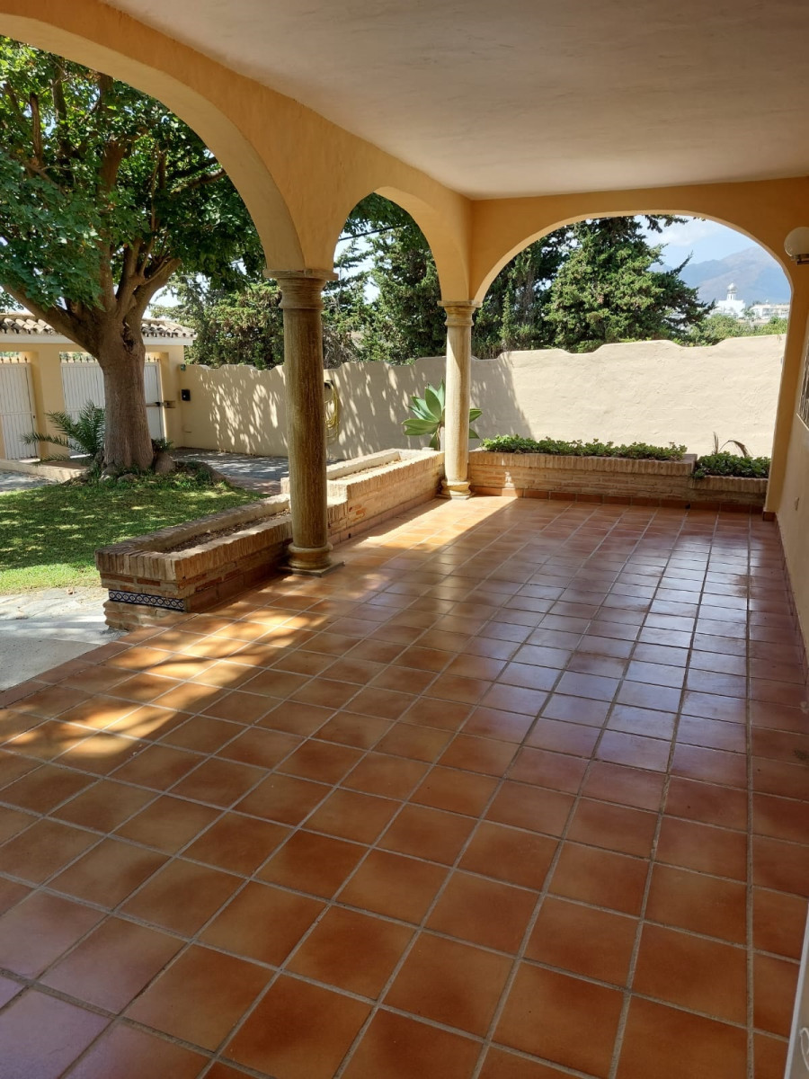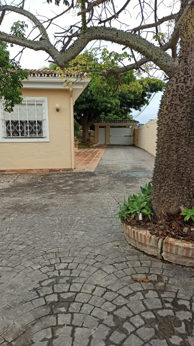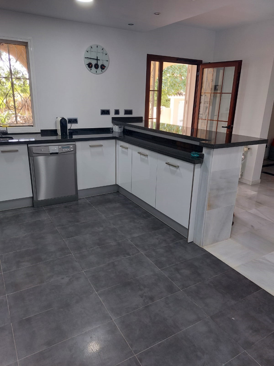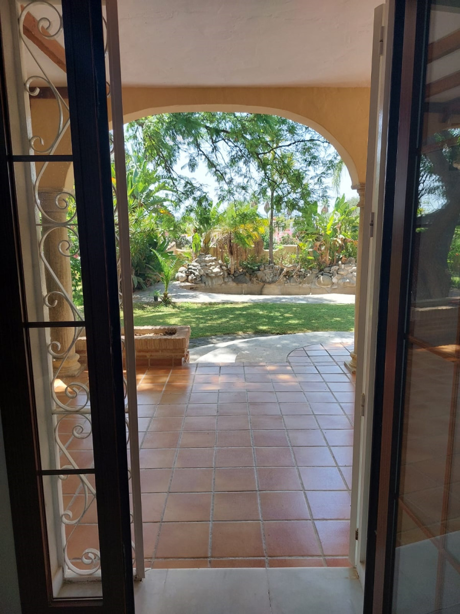 Bonita villa en alquiler Larga temporada en zona Selwo. Villa de gran tamaño, con orientación sureste. Dispone de gran salón comedor con chimenea, cuatro dormitorios, un despacho, cocina equipada, habitación independiente para invitados o servicio, y con gran parcela con piscina, jardín y fuente. Incluye el agua ya que tiene pozo propio. Dispone de alarma y la jardinería está incluida.