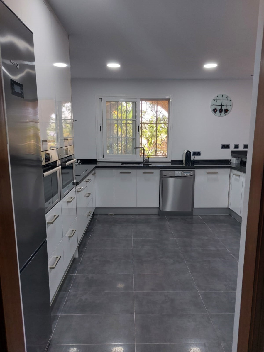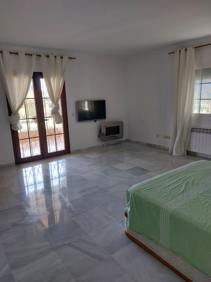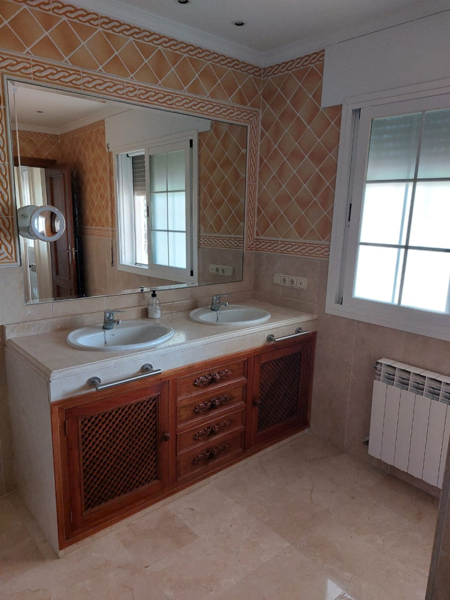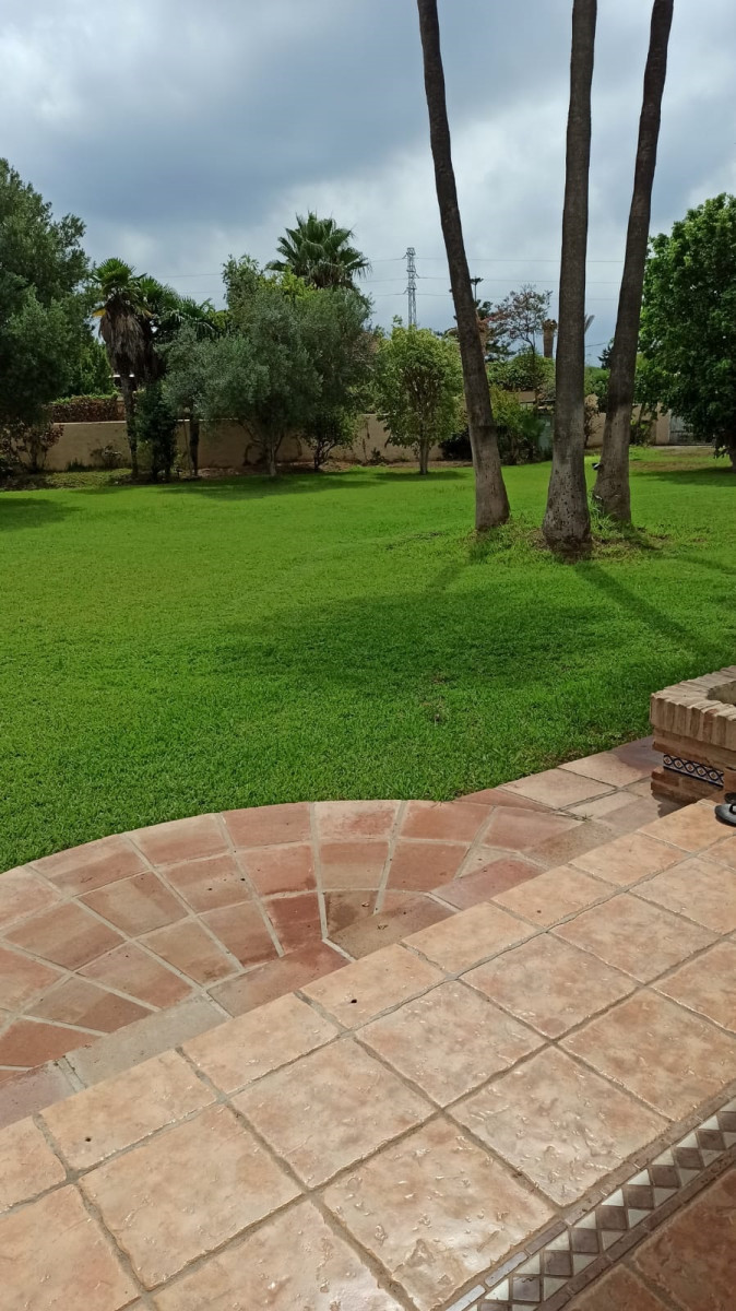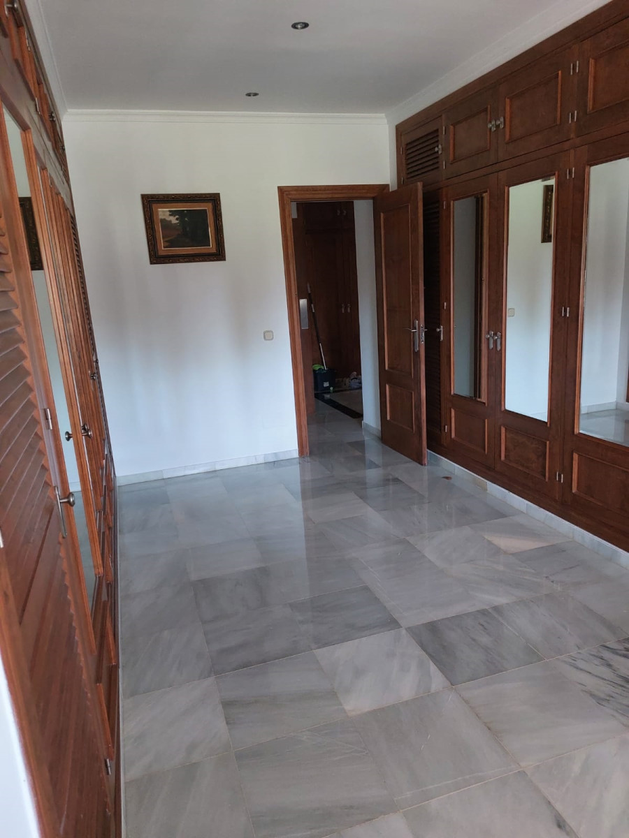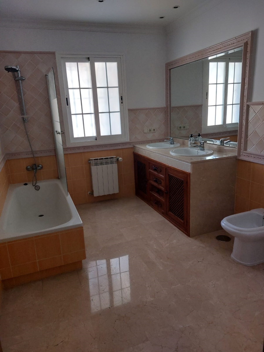 Bonita villa en alquiler Larga temporada en zona Selwo. Villa de gran tamaño, con orientación sureste. Dispone de gran salón comedor con chimenea, cuatro dormitorios, un despacho, cocina equipada, habitación independiente para invitados o servicio, y con gran parcela con piscina, jardín y fuente. Incluye el agua ya que tiene pozo propio. Dispone de alarma y la jardinería está incluida.