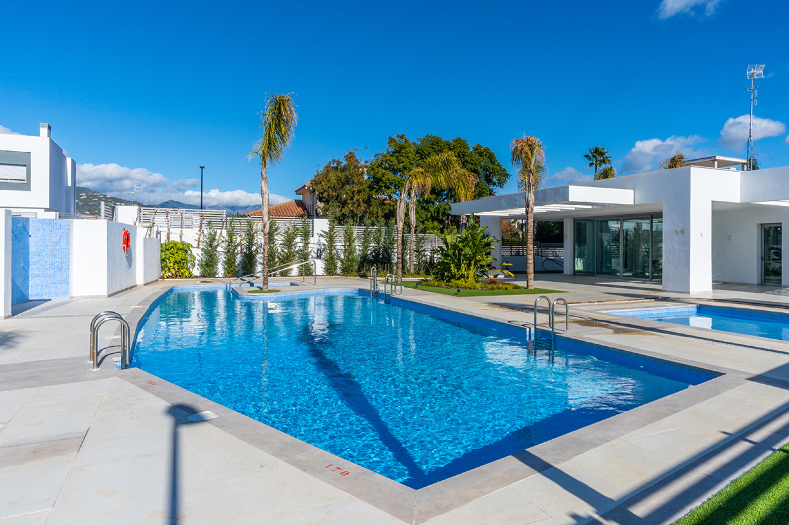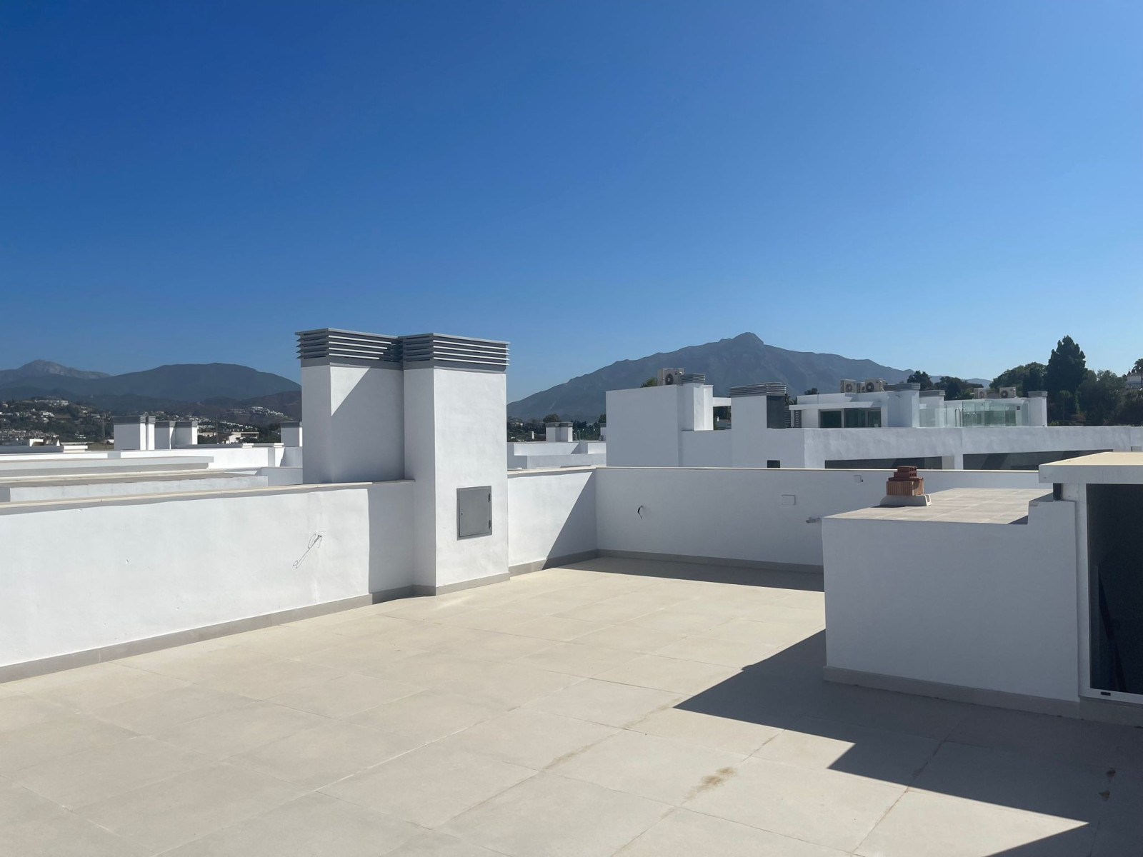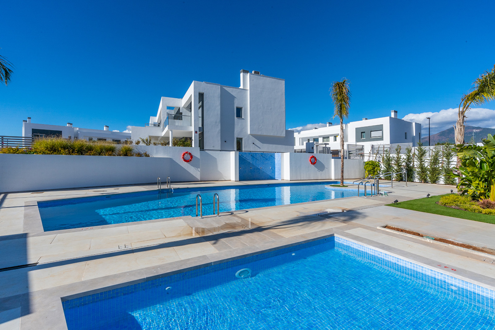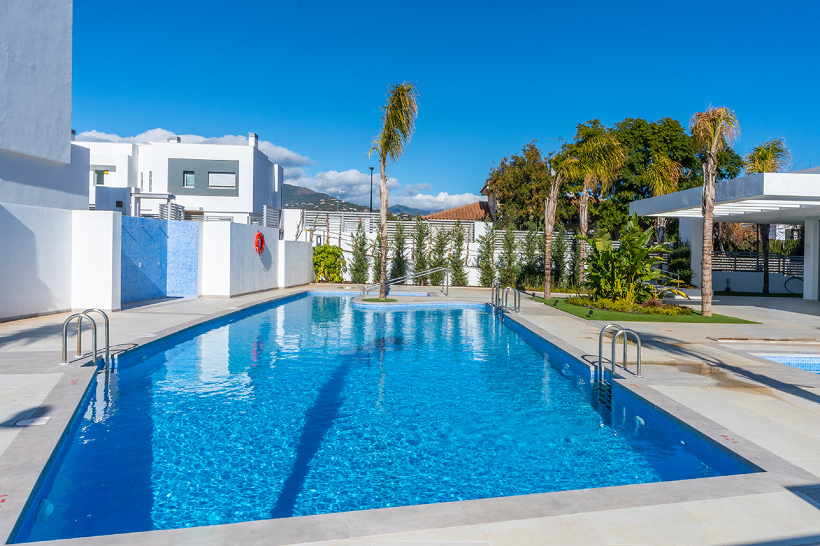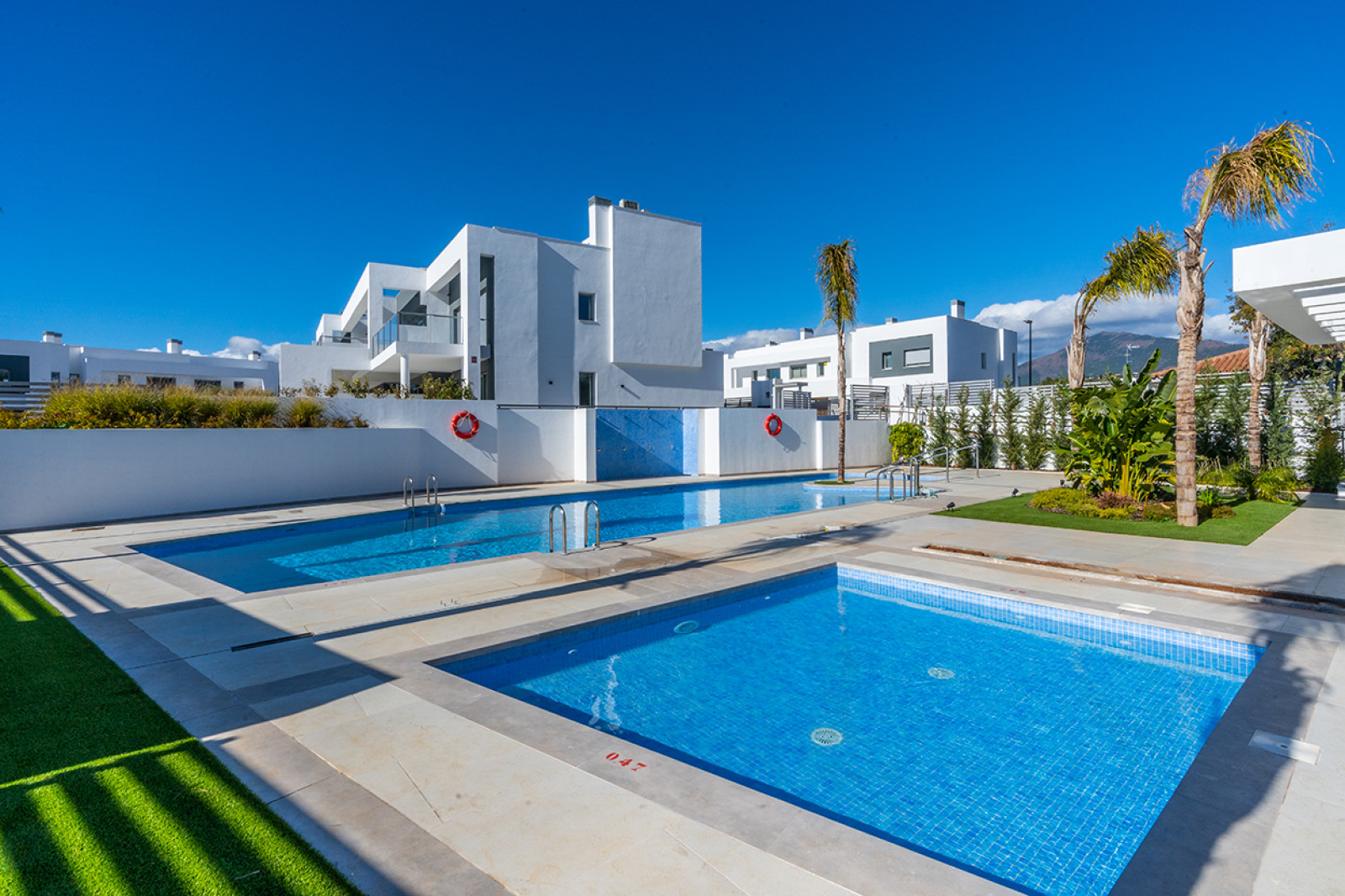 EXCLUSIVA VILLA SEMI ADOSADA DE NUEVA CONSTRUCCIÓN Espectacular villa de nueva construcción en urb. Guadalmina Alta, con los mejores estándares de construcción, La vivienda dispone de 2 plantas más sótano, en planta baja hay un gran salón comedor con cocina totalmente equipada con concepto abierto, lavadero, hall de entrada, porche y terraza con acceso a jardín privado. En la planta alta nos encontramos los dormitorios con cuartos de baños, y escalera que da al solarium. En la planta sótano dispone de garaje, trastero, y sala multiusos. Tiene suelo radiante en toda la casa y aire acondicionado. La comunidad dispone de gran piscina, piscina infantil, zona coworking y gimnasio a parte de zona ajardinada.