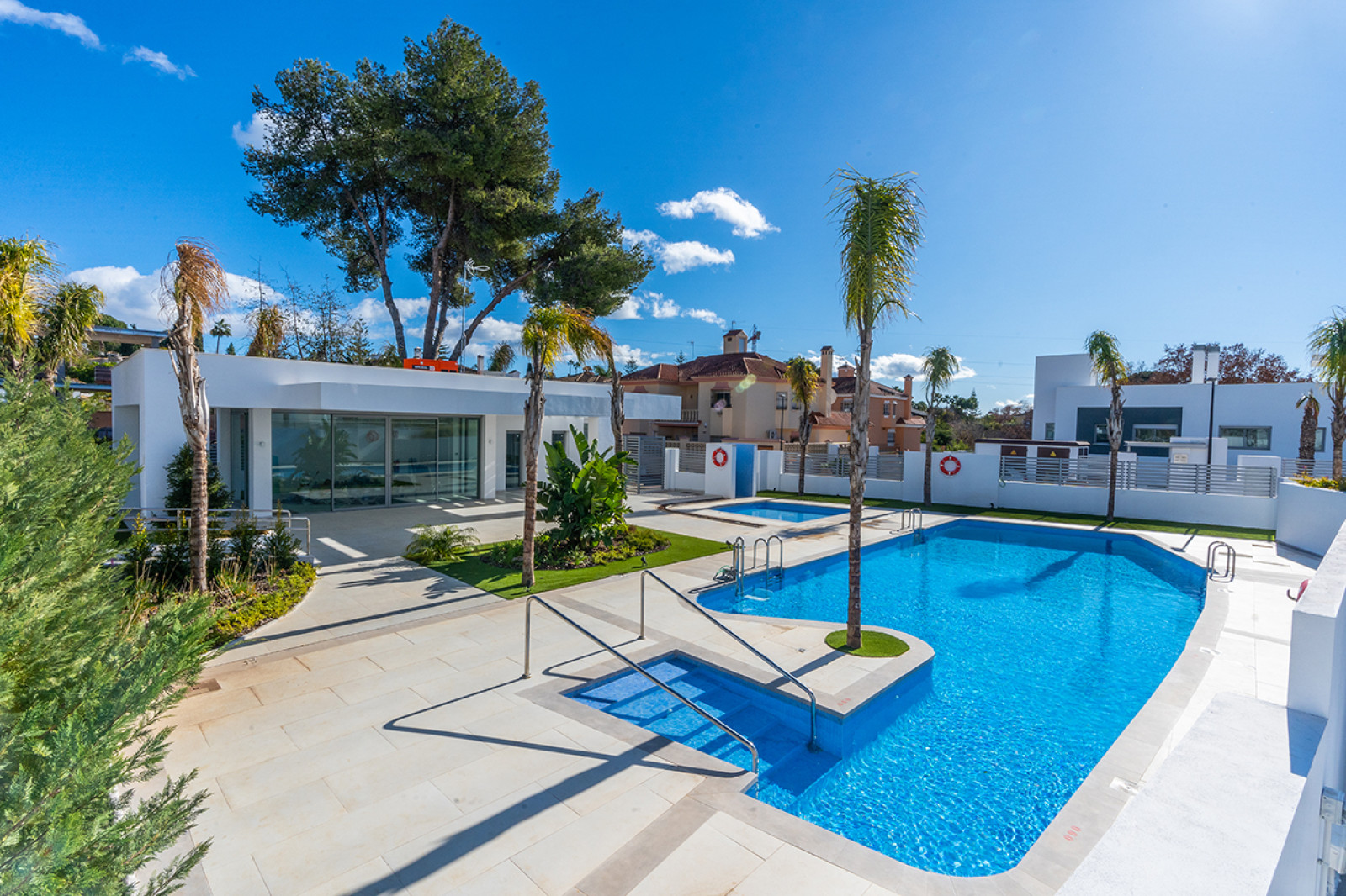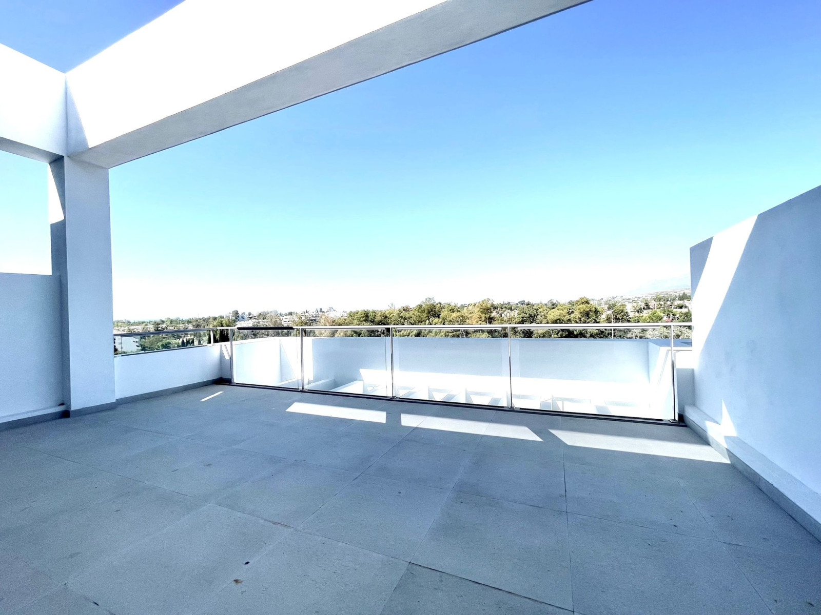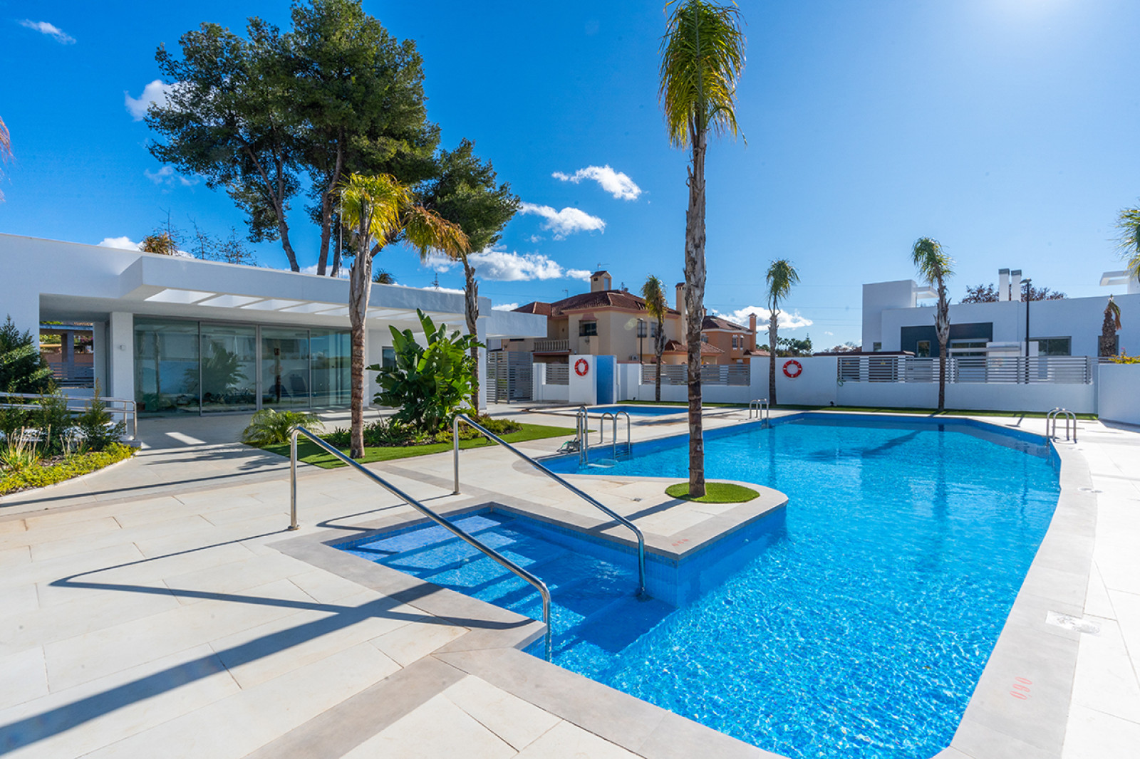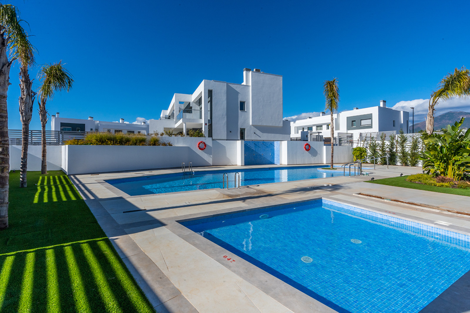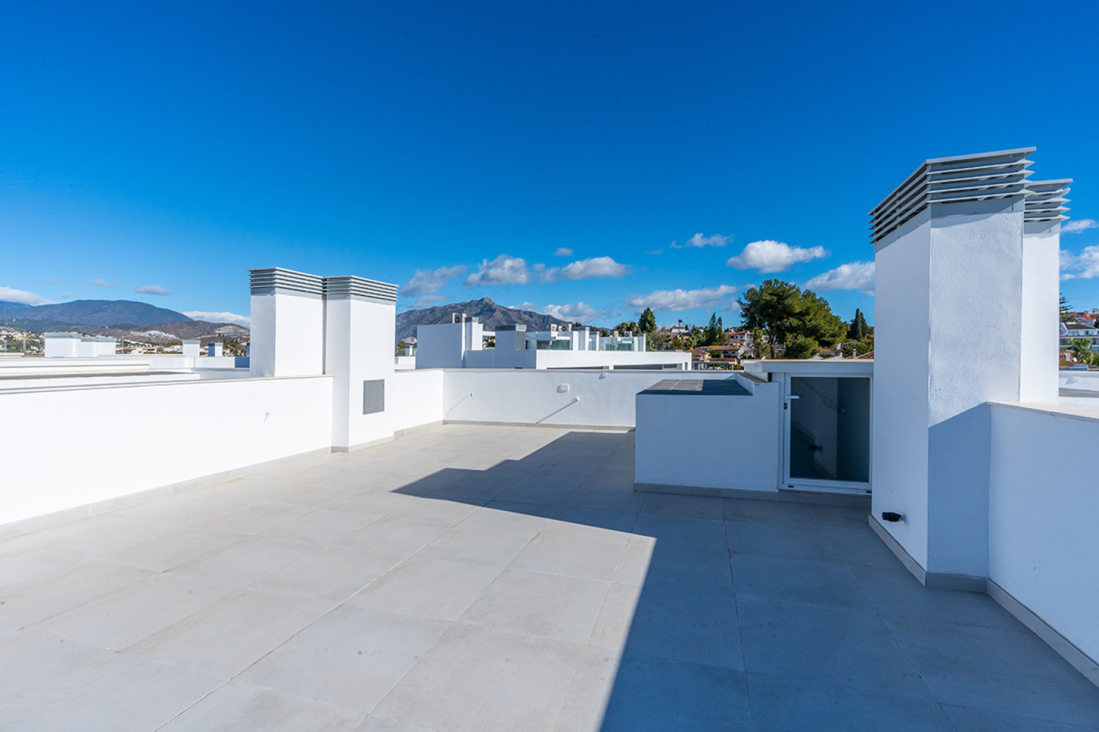EXCLUSIVA VILLA SEMI ADOSADA DE NUEVA CONSTRUCCIÓN Espectacular villa de nueva construcción en urb. Guadalmina Alta, con los mejores estándares de construcción, La vivienda dispone de 2 plantas más sótano, en planta baja hay un gran salón comedor con cocina totalmente equipada con concepto abierto, lavadero, hall de entrada, porche y terraza con acceso a jardín privado. En la planta alta nos encontramos los dormitorios con cuartos de baños, y escalera que da al solarium. En la planta sótano dispone de garaje, trastero, y sala multiusos. Tiene suelo radiante en toda la casa y aire acondicionado. La comunidad dispone de gran piscina, piscina infantil, zona coworking y gimnasio a parte de zona ajardinada.