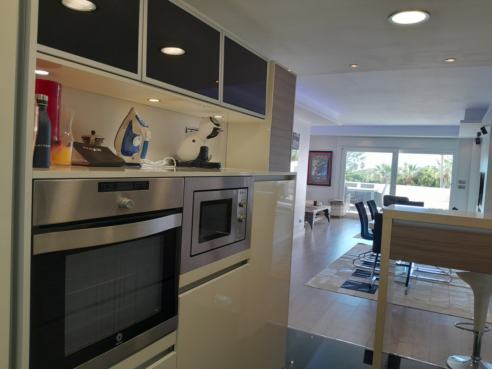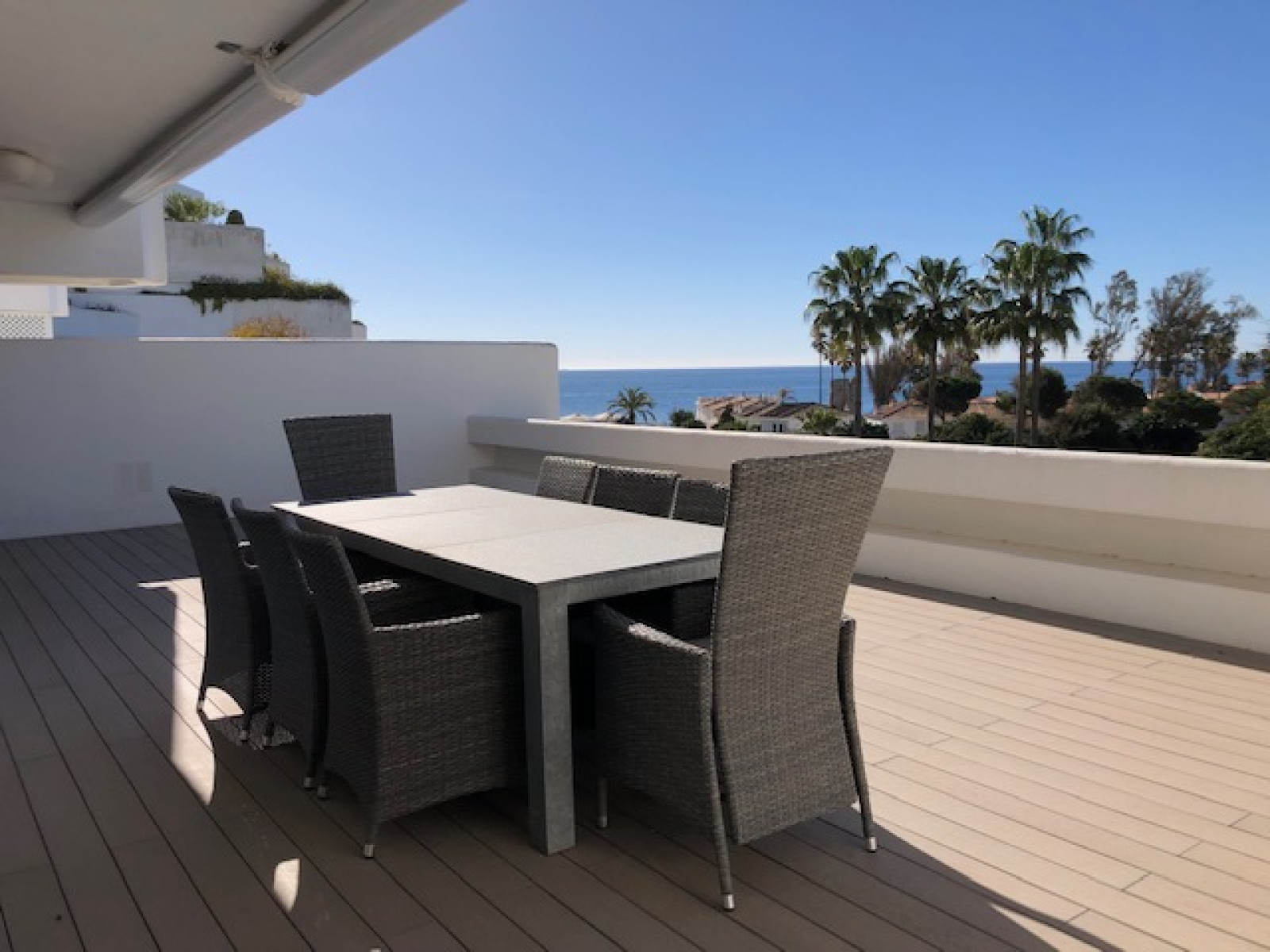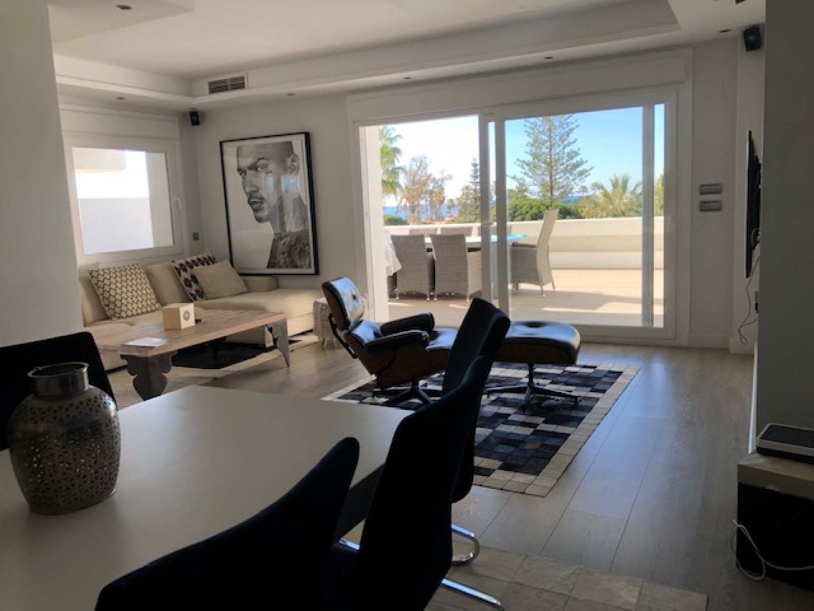 AMPLIO APARTAMENTO CON VISTAS AL MAR. Espectacular apartamento con excelentes vistas al mar en una de las mejores urbanizaciones de Guadalmina Baja, Parque del sol urbanización en primera línea de playa. Este apartamento destaca por su luminosidad y sus vistas al mar. Cuenta con 2 dormitorios dobles, cada una con cuarto de baño en suite. La cocina, totalmente reformada y equipada, se integra perfectamente con el espacioso salón-comedor, creando un ambiente ideal para disfrutar de momentos inolvidables, además fácilmente se puede cerrar, espacioso salón-comedor que da acceso a una amplia terraza de 88 m², con zona relax y comedor para disfrutar de las vistas al mediterráneo. El apartamento dispone de aire acondicionado, armarios empotrados, ventanas con doble acristalamiento. Además, incluye una plaza de garaje subterráneo en el precio. La urbanización cuenta con servicios de primera calidad, como seguridad 24 horas, amplias zonas ajardinadas, una piscina comunitaria y acceso directo a la playa.