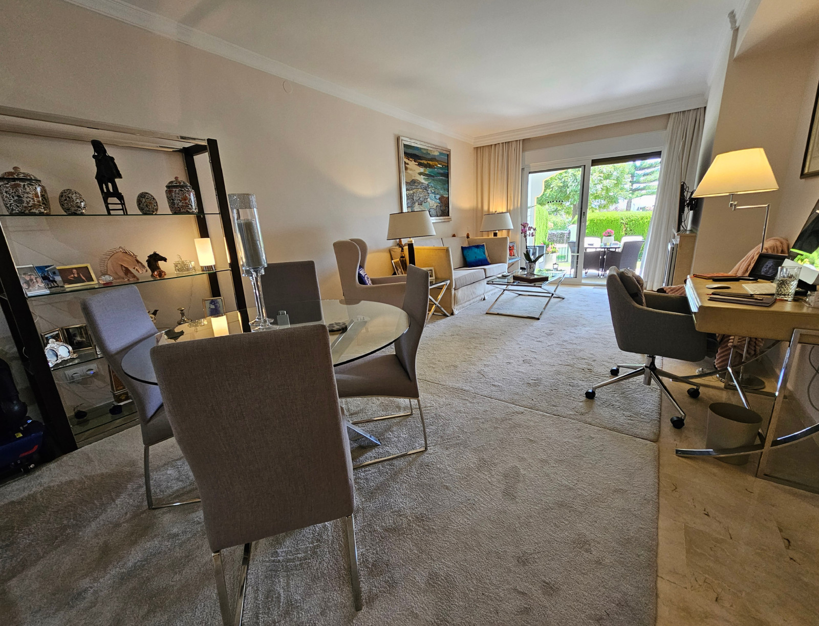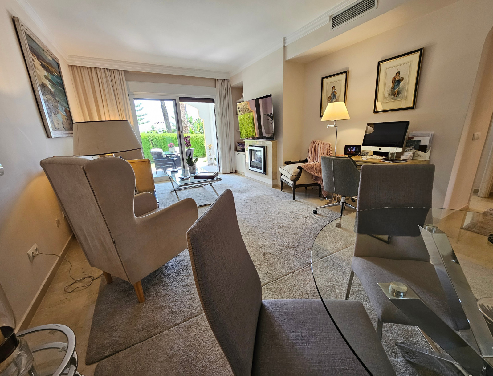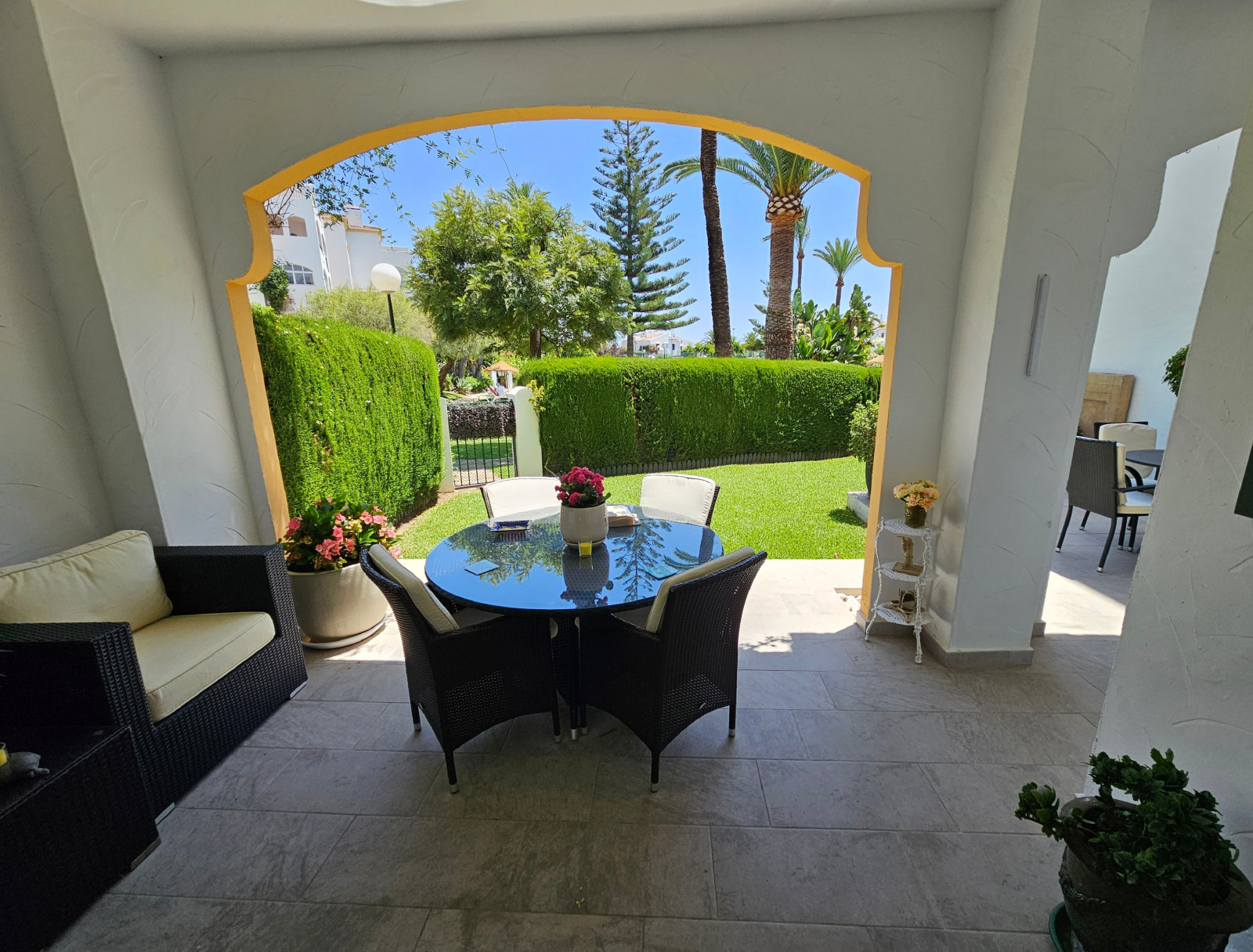 Planta Baja con Jardín Privado en Cerro Blanco, Nueva Andalucía Este impecable apartamento reformado se encuentra en la urbanización cerrada de Cerro Blanco, a un paso de Centro Plaza, Puerto Banús y la playa. La vivienda cuenta con dos dormitorios, dos baños y un acogedor salón con chimenea que abre a un porche y a su amplio jardín privado con orientación sureste. Situado en un complejo de estilo andaluz con piscina, tenis y jardines maduros, el apartamento destaca por su comodidad al incluir plaza de garaje y parking exterior privado junto a la entrada. Es la opción ideal para disfrutar de la privacidad de un jardín propio con la ventaja de tener todos los servicios, comercios y restaurantes a mano.