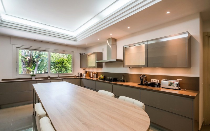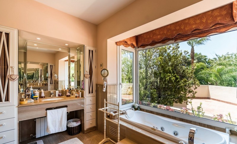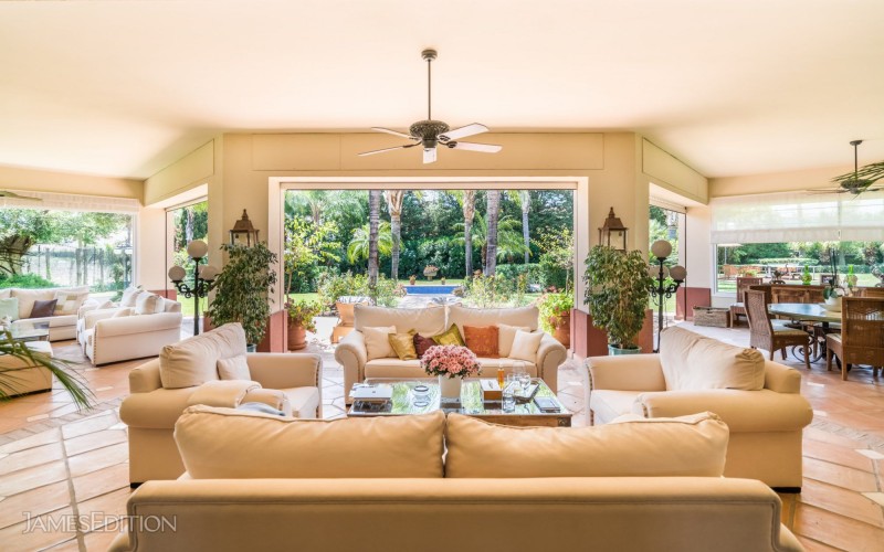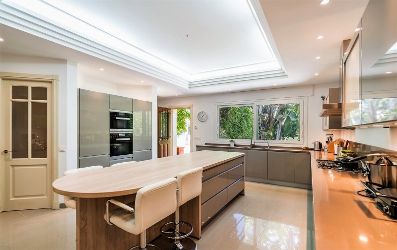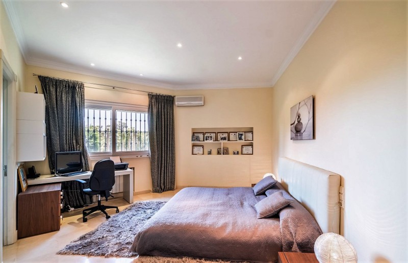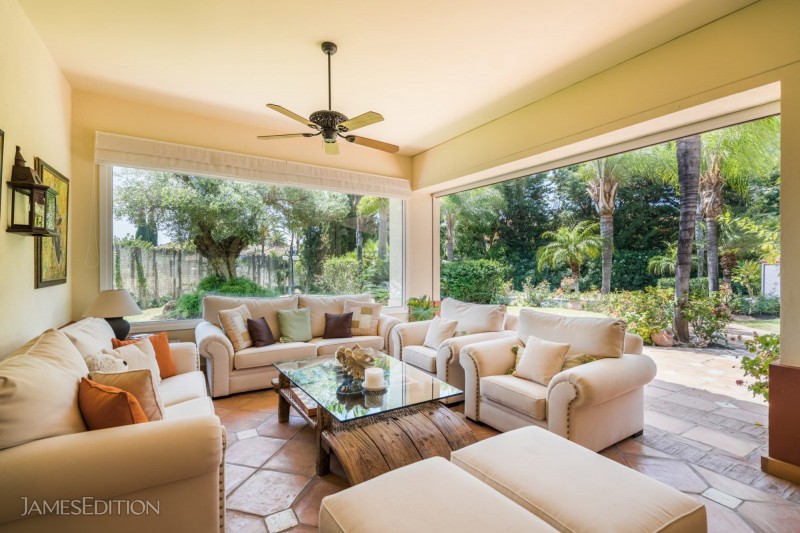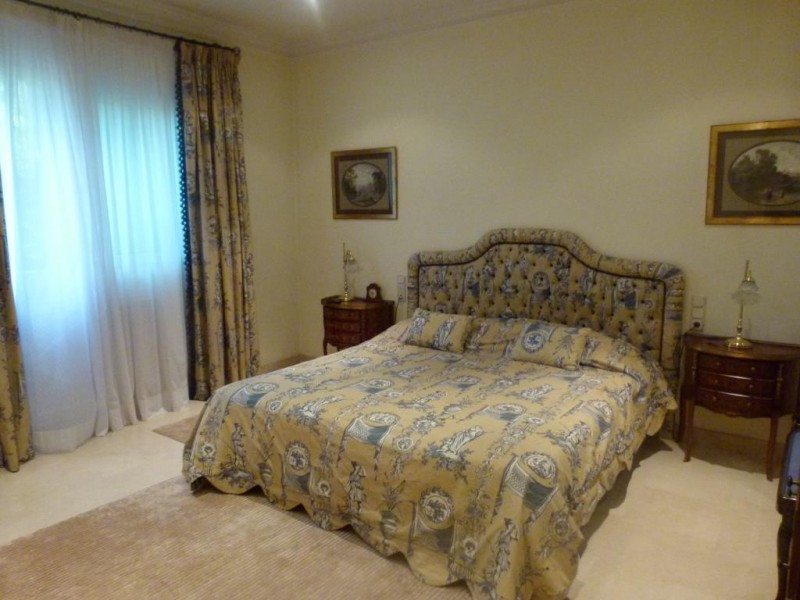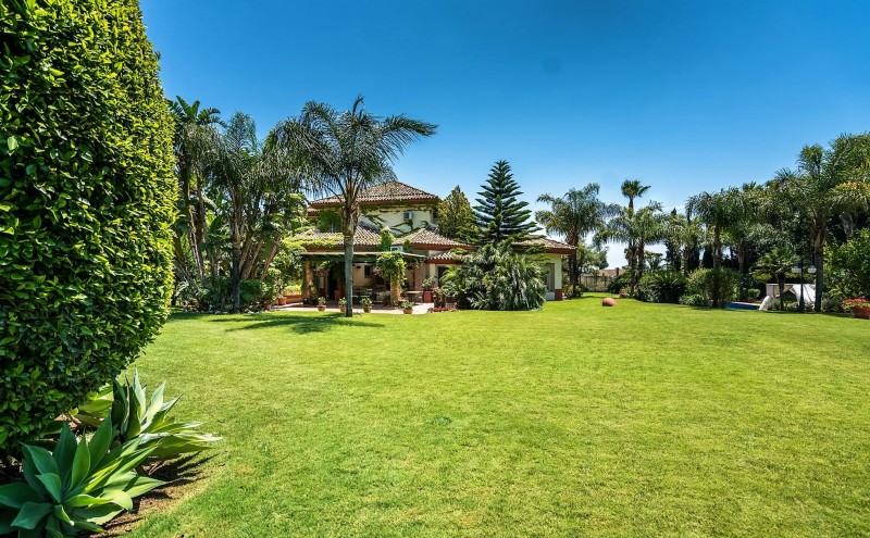 Elegante villa muy privada en una zona tranquila de Guadalmina Baja, cerca de la playa y de campos de golf. La propiedad está rodeada de exuberantes jardines tropicales con amplia piscina. Construida con un total de 1.262m2 y con excelentes materiales se distribuye en 3 niveles y consta de: en nivel de entrada: amplio hall; salón muy grande con acceso al porche cubierto; sala de TV con chimenea y con acceso a la terraza principal; 2 dormitorios en suite; comedor separado con acceso a la cocina moderna completamente equipada y barbacoa exterior; zona de lavadero. Nivel superior: amplio corredor con zona de estar que da acceso a la amplia suite principal y otra suite de invitados, ambos con acceso a una amplia terraza con vistas al jardín y a la piscina. Sótano: bodega con barbacoa y comedor, aseo de invitados, sala de cine, zona de servicio con 2 dormitorios y un baño, amplio garaje para más de 7 coches. Su calidad constructiva incluye, solería de mármol marfil, aire acondicionado, sistema de alarma, calefacción centralizada, suelos radiantes en baños. Una preciosa casa familiar para vivir todo el año.